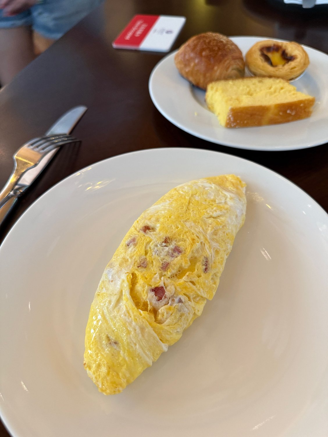- Breakfast (only offered in restaurant) was good - I enjoyed my omelet, hashbrown, and stuffed beef pancake - I also liked the barista coffee (nice surprise)