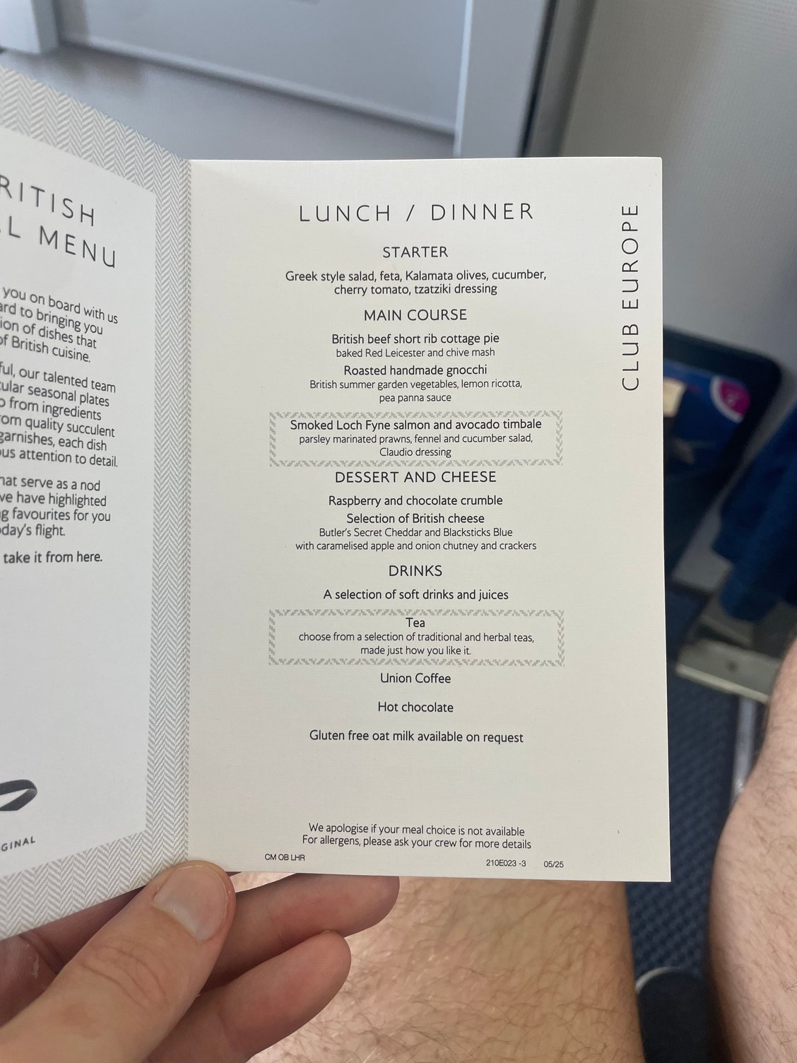 Friend had the gnocchi and reported that it was excellent. 7 rows of Club. IFL reasonably proactive in topping up my champagne. 🥂