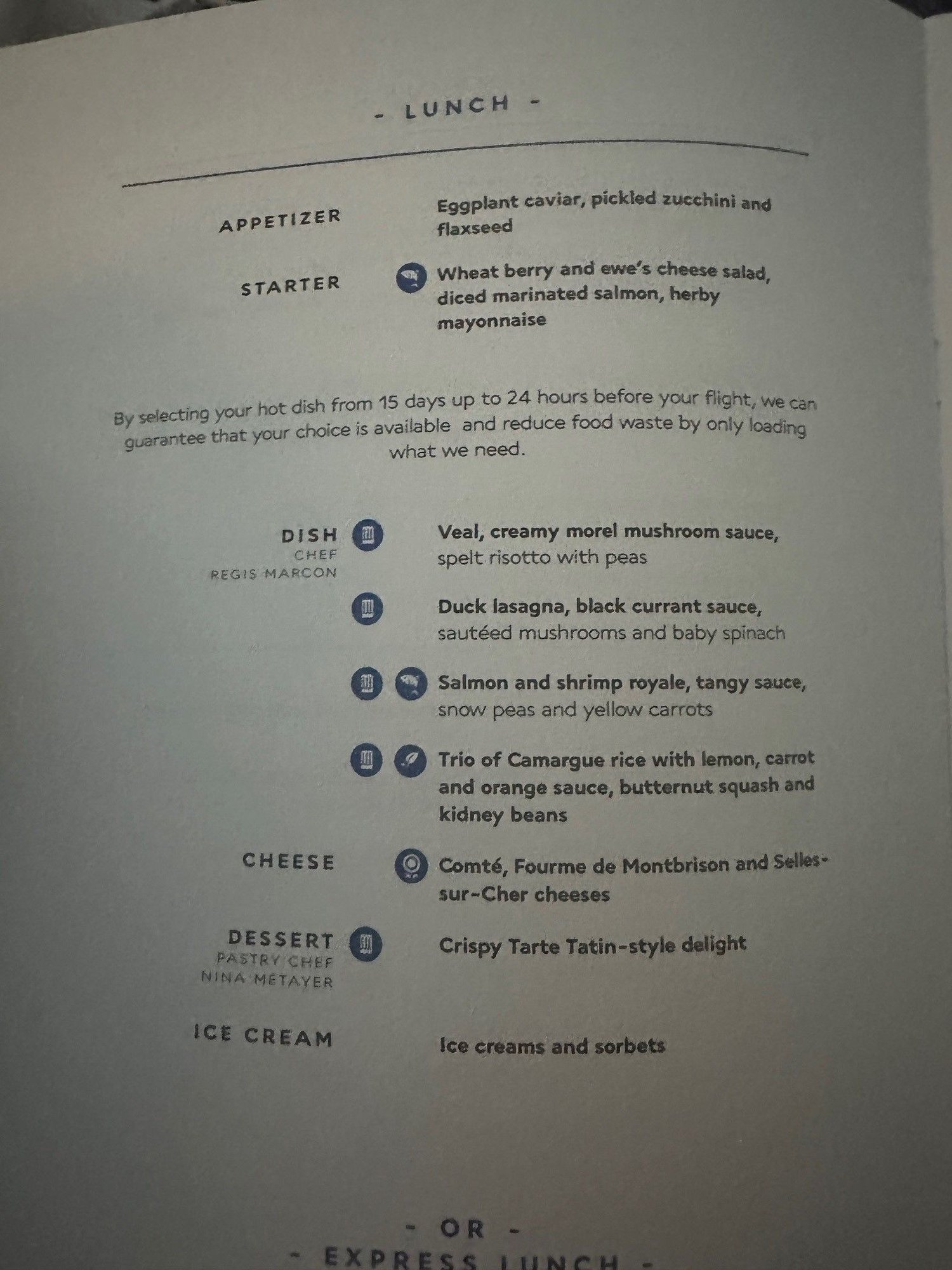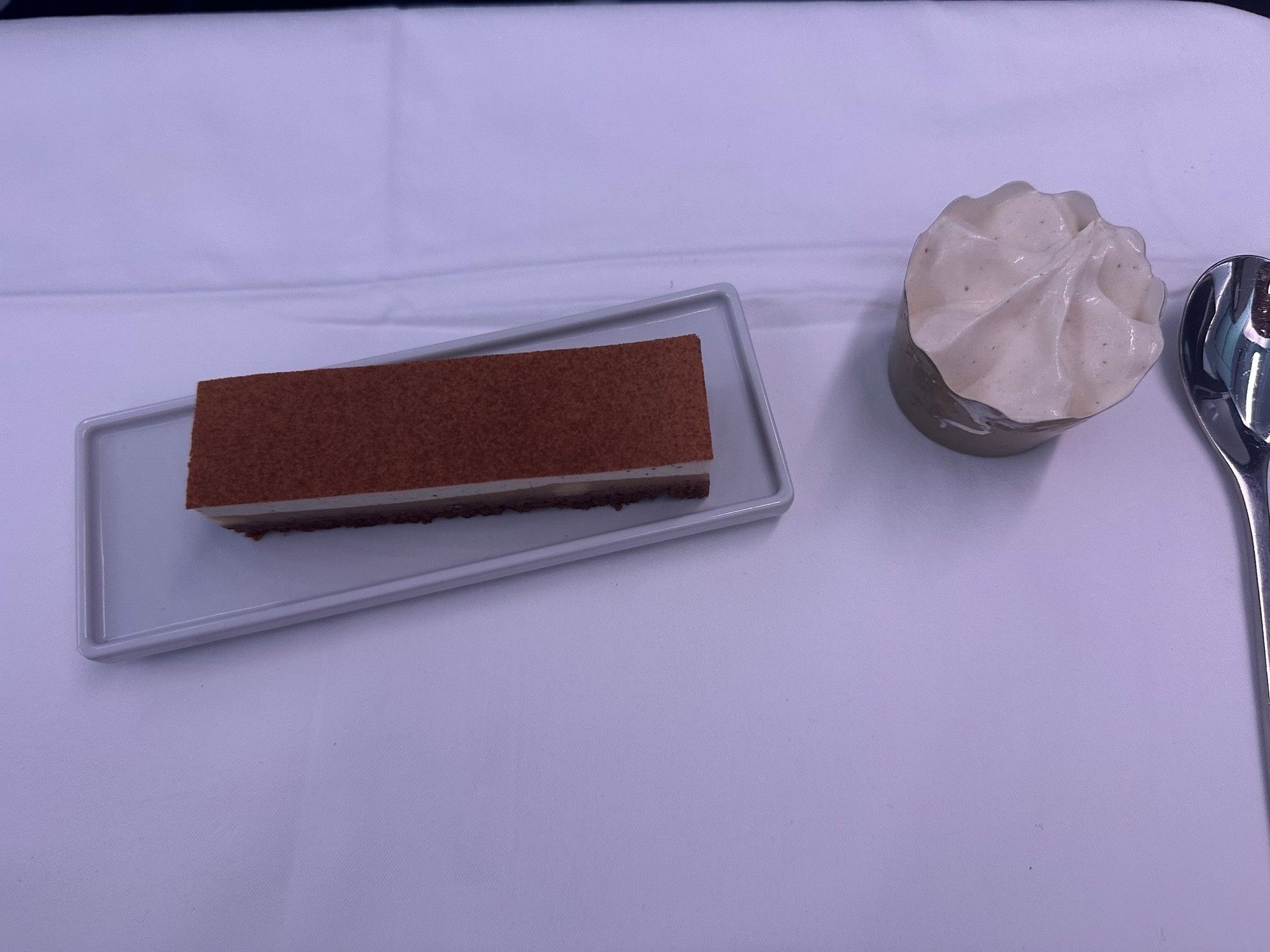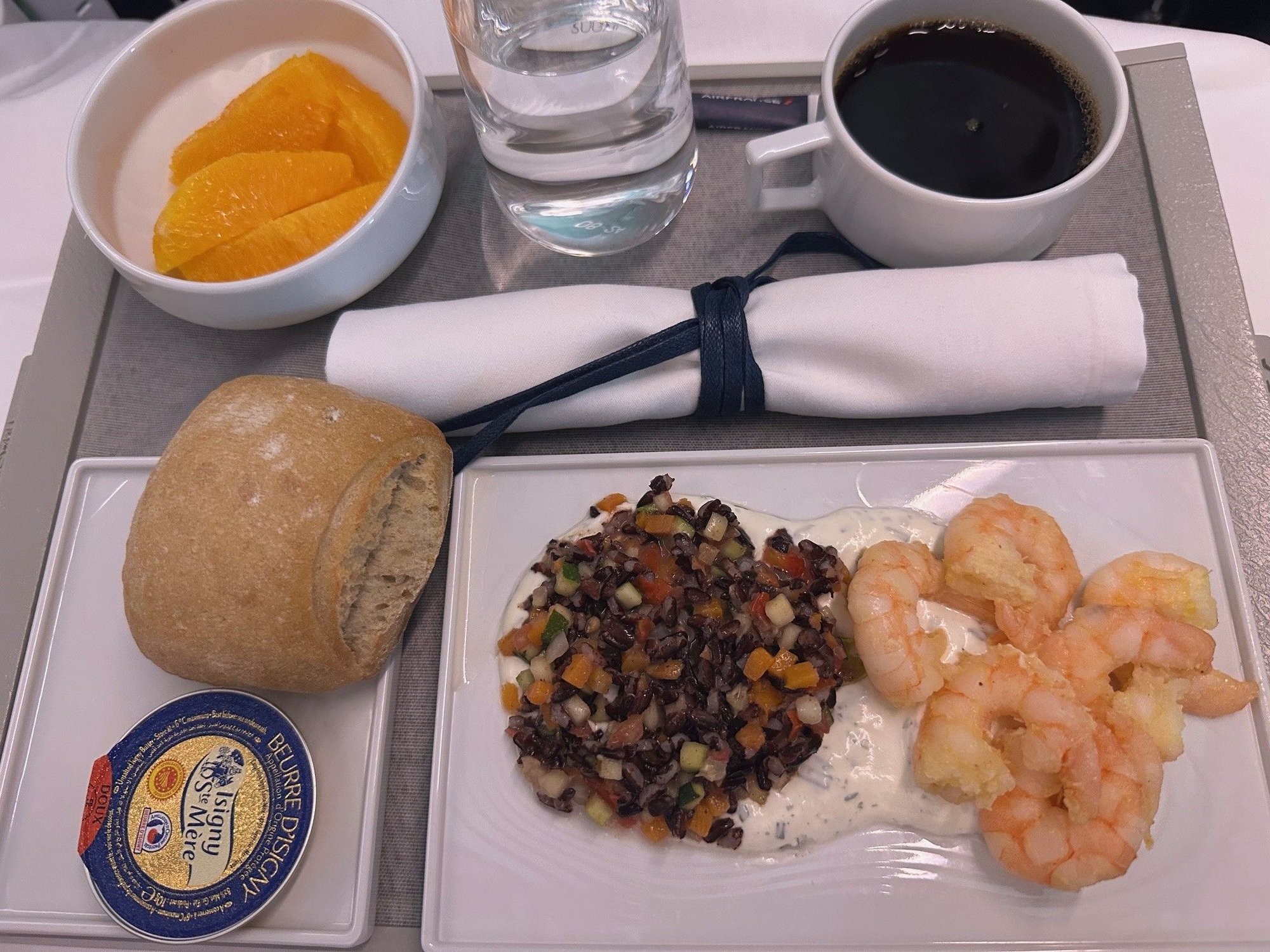 Pretty good meal service on CDG-ORD yesterday. I had the salmon and shrimp which was solid, if a little basic -- I mean this as a positive review but I found myself thinking while eating it, "this is like those rare days when you have a domestic first class meal on the US airlines where you think, hey, this is actually pretty good?" As in, it was good and entirely edible, but nothing special by international business class standards. My husband had the duck lasagna and liked it though said there wasn't ultimately a lot of duck.