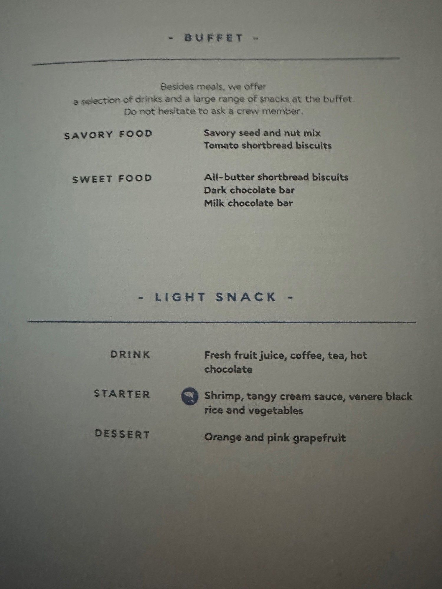 Pre-landing meal was quite good, with a decent amount of shrimp. The fruit seemed to be oranges or the like rather than the marketed grapefruit, which were at least decently sweet; grapefruit slices would make for a rather puritan dessert.