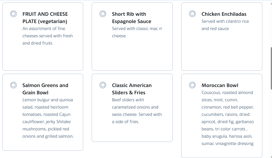 Choices for an upcoming flight. I see good advice above about the salmon bowl but how are the sliders or the chicken enchiladas? Have had the short ribs many, many times. The Moroccan bowl sounds good except I can't stand raisins.