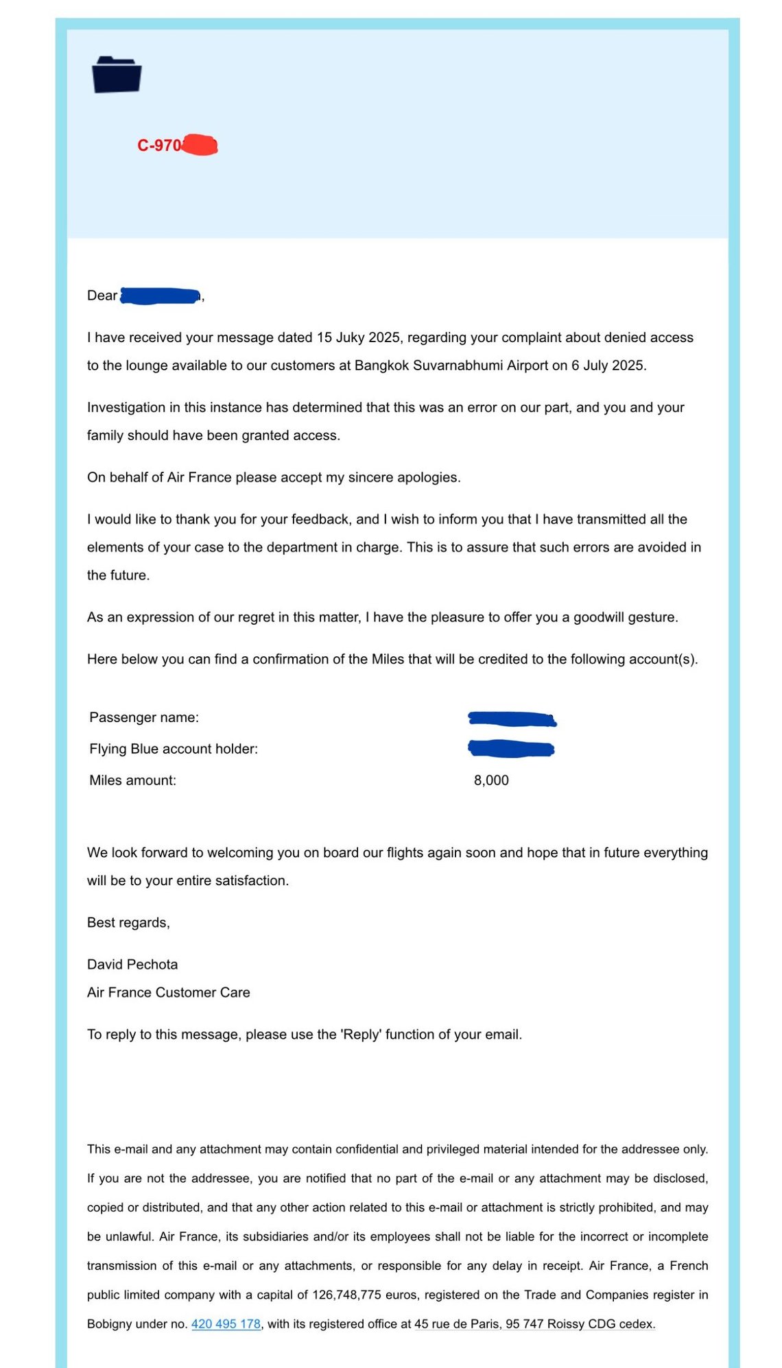 I wanted to follow up and share with you the reply from Air France, acknowledging that we were improperly denied lounge access at BKK. They offer me 8,000 miles, which is nice.