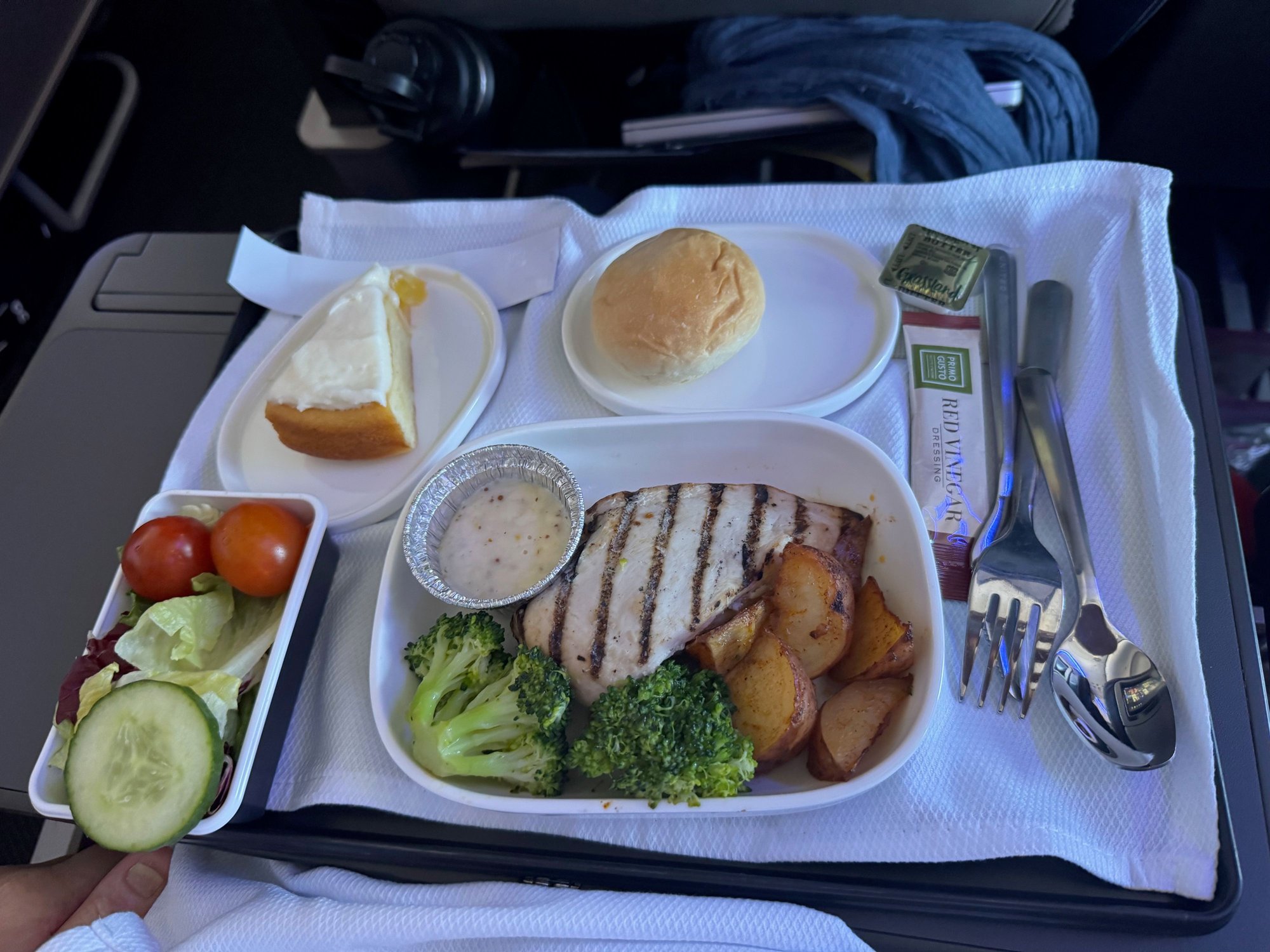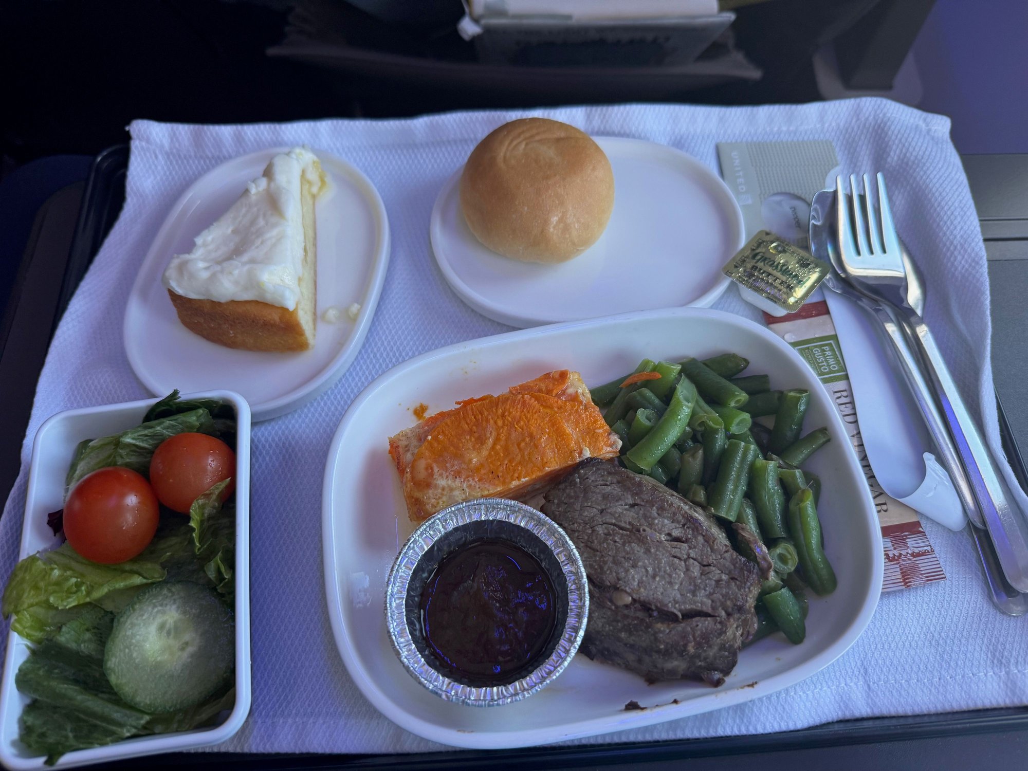 Lots of GS on the flight, they got the first visit and first food fix from the purser. No special attention to the 1Ks. I'm pretty sure the GS's were also offered compensation for the catering issues but no one else was. I may write in. Preorders didn't work because they didn't load our flight's food. Choices were chicken, beef, and pasta. Purser described them more but I don't remember. Ms. 9A had the chicken, I had the beef. Among all the mess, I do think LSG food is better than the old stuff. Everything was at least passable. The brocolli with the chicken was overcooked and the beef was a little on the tough side, but the chicken was actually flavorful and the salads were pretty good (red wine vinegrette in a packet). I am very thankful for the lemon cake instead of the the magnolia slop, though it was a tad sweet for my taste.