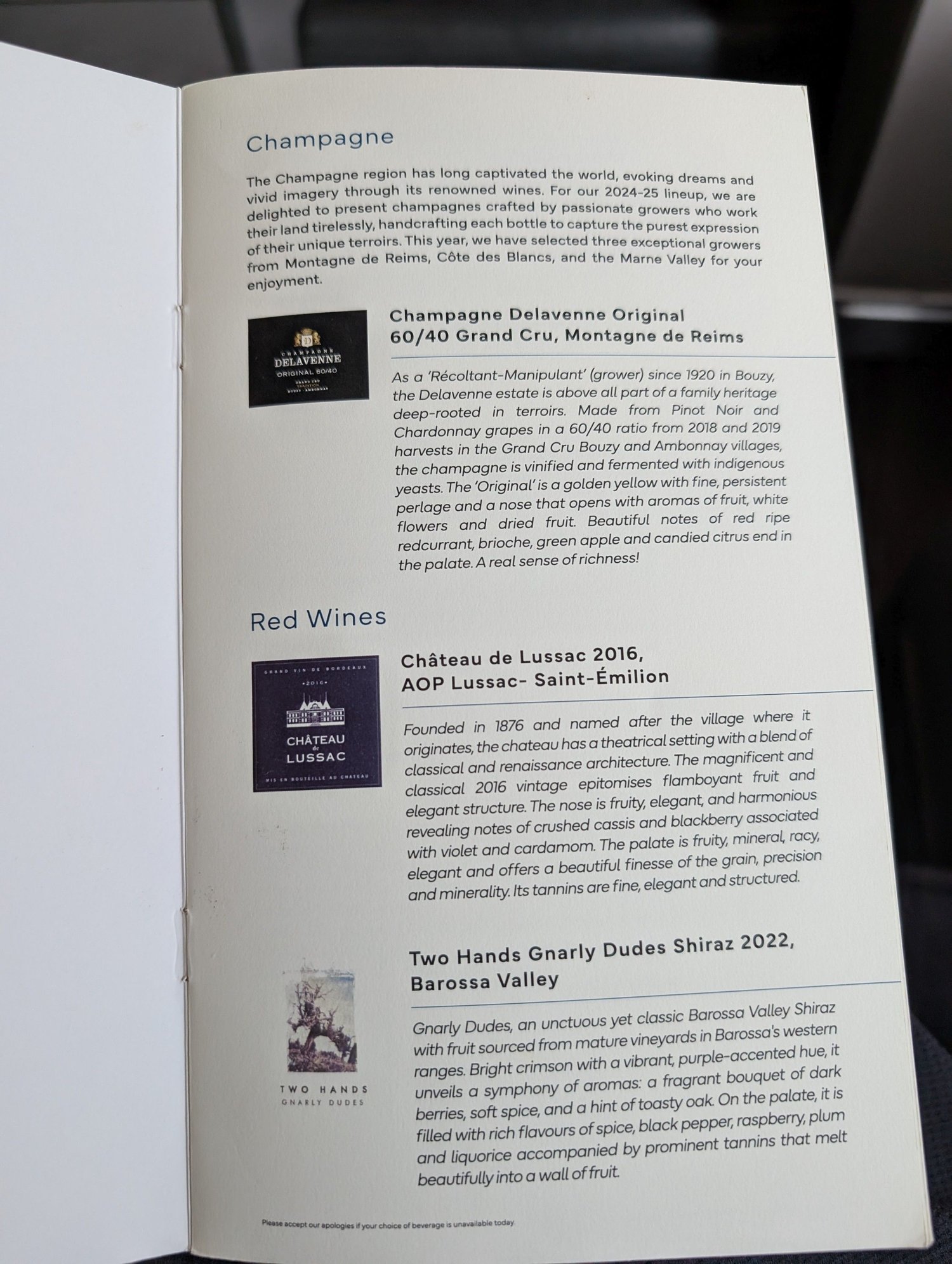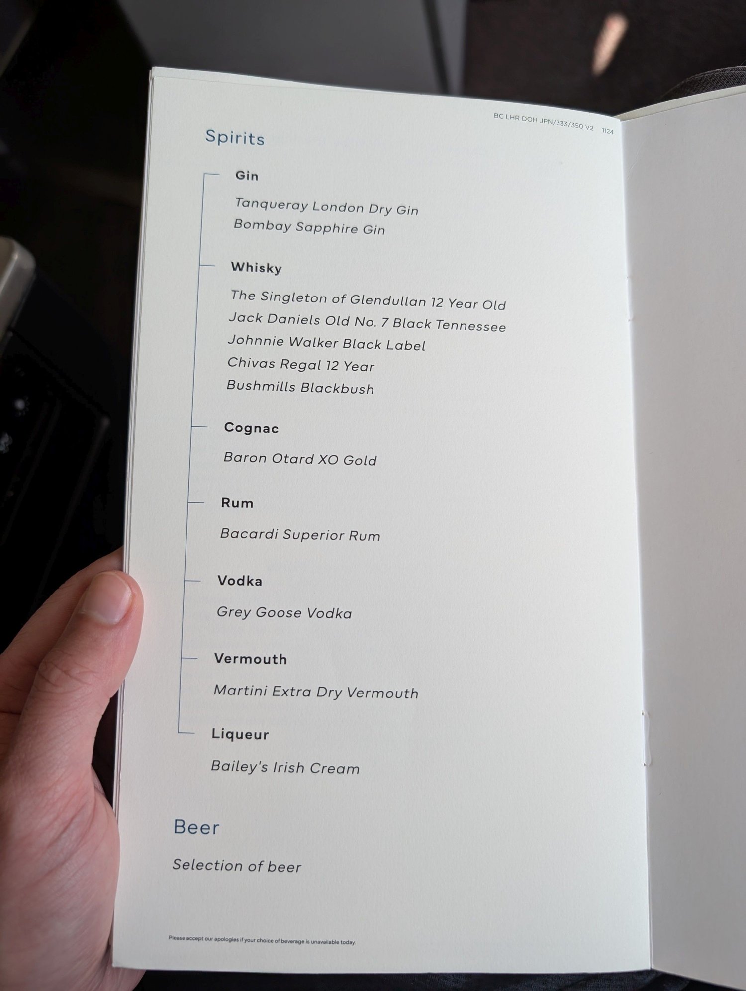 You will notice there's no alcoholic drinks on the drinks page of the Business Class menu.