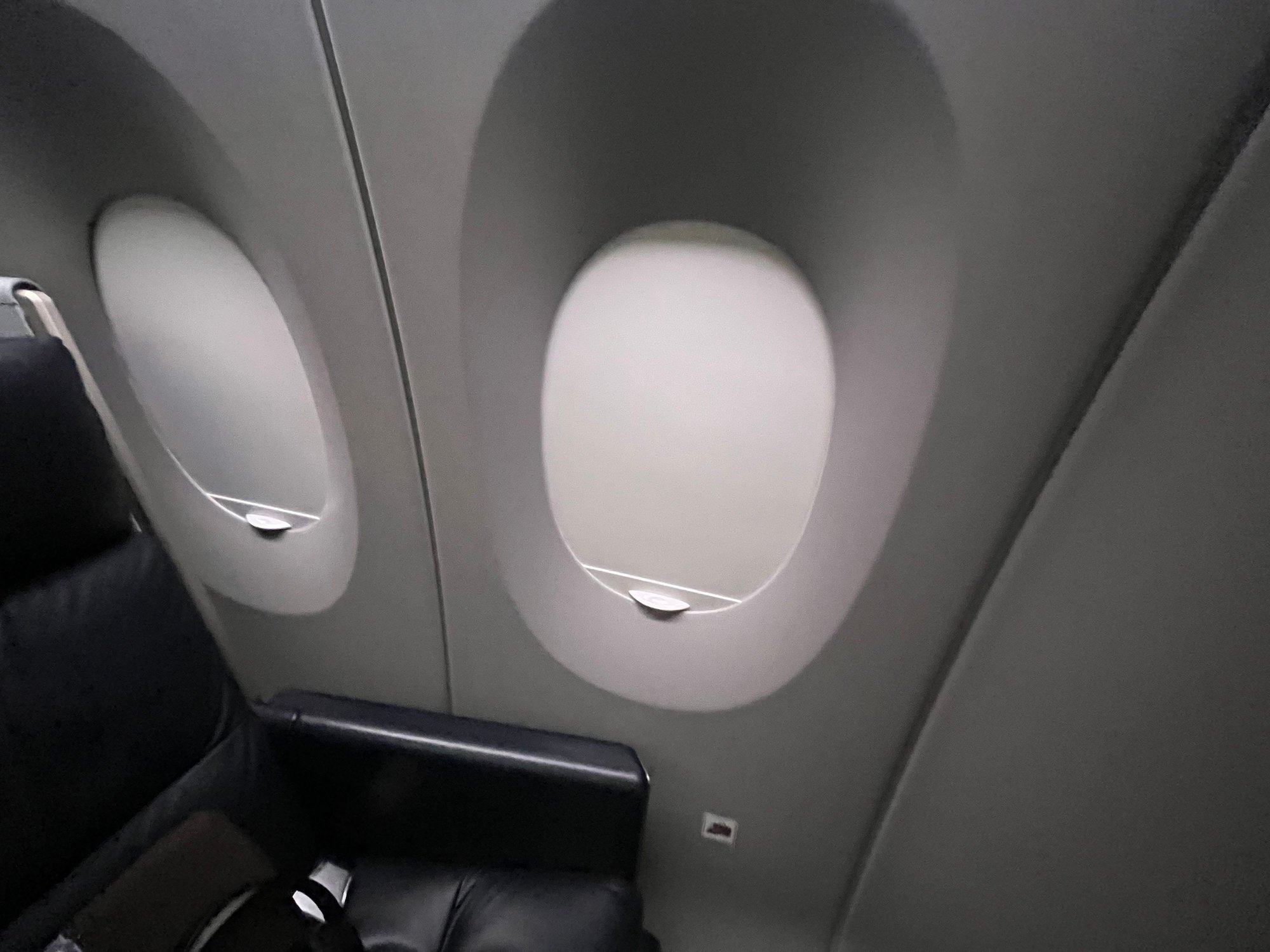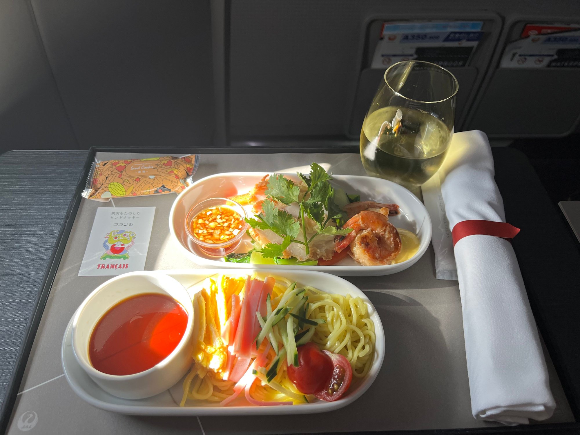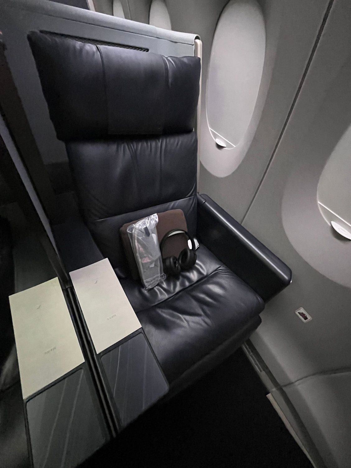 Boarding the plane, I was surprised to see the A350 domestic F cabin had all the window shades down, creating a rather dimly lit environment. I also was impressed that JAL could board a full A350 in just 20 minutes! Many European airlines struggle to board an A319 in that time.