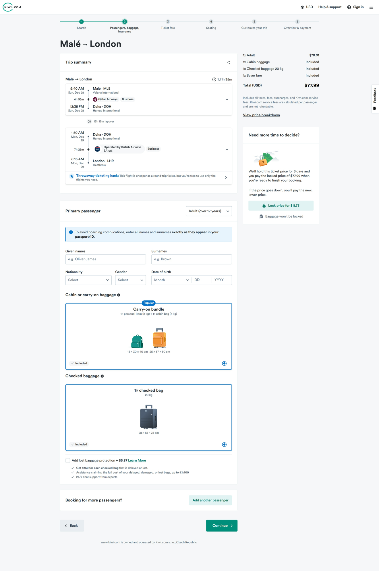 Kiwi junk (probably won't get a ticket number) - Qatar Airways - Male, Maldives (MLE) to London, UK (LHR / LGW) - from $78 USD one-way in business.