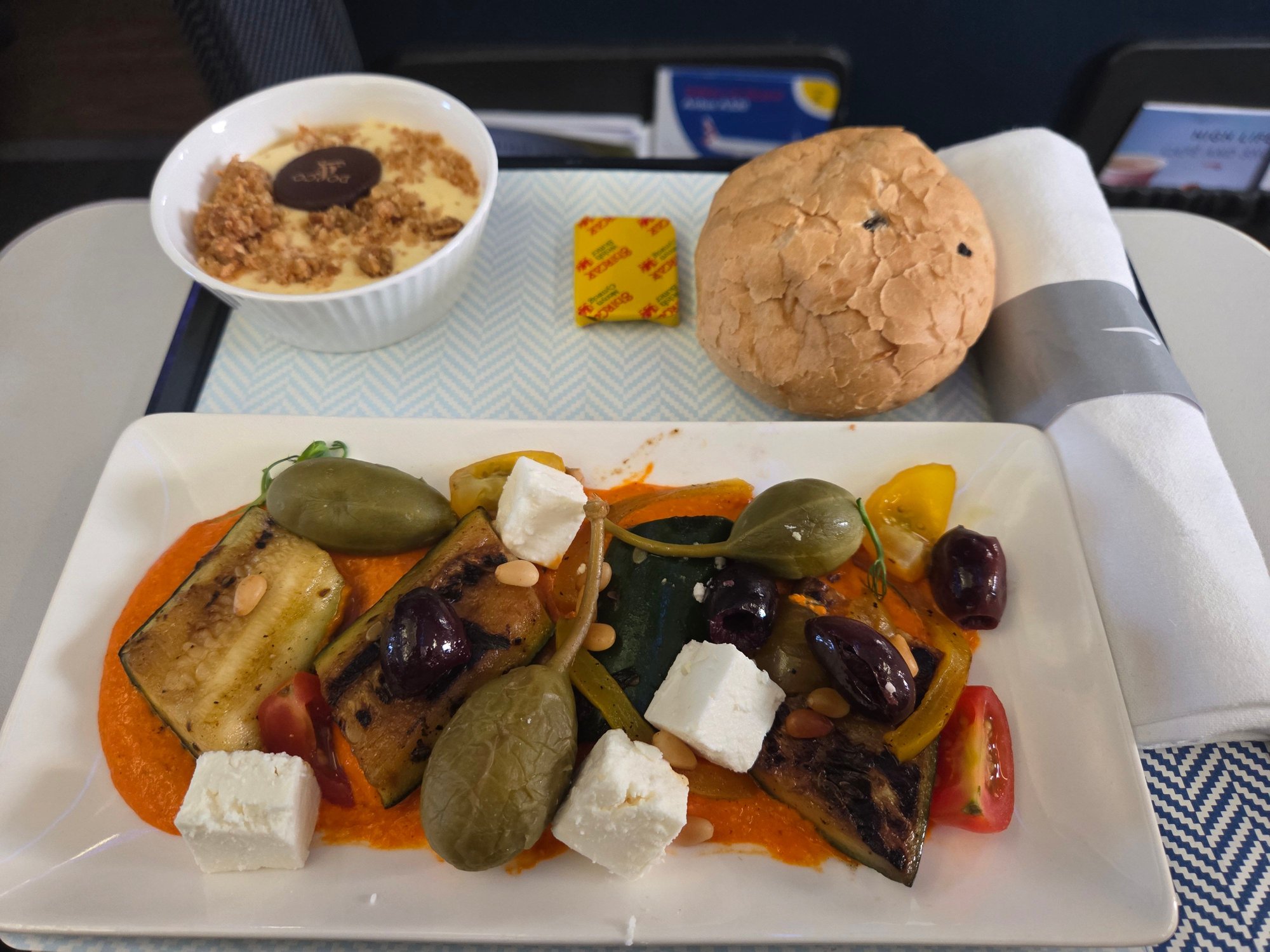 BA316 [LHR-CDG] band 1 dep. 19:10. Here's the courgette salad which was very nice. The alternative being the ploughman's. Absolute stellar crew on this short flight.