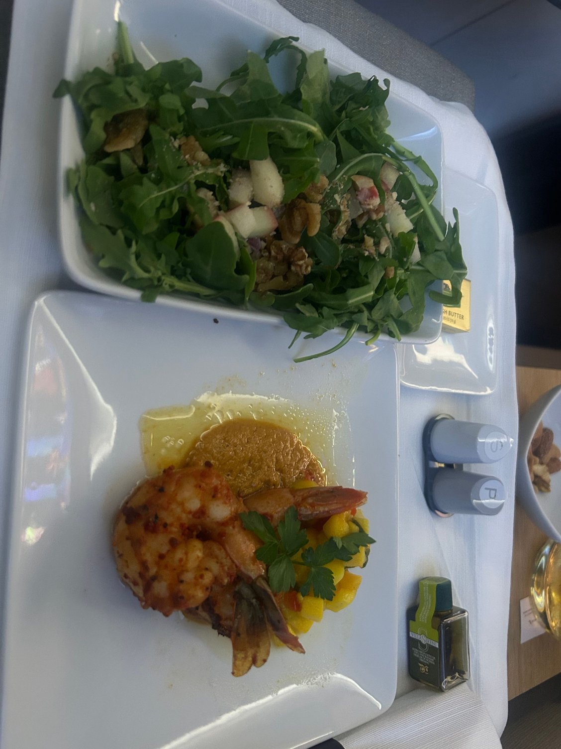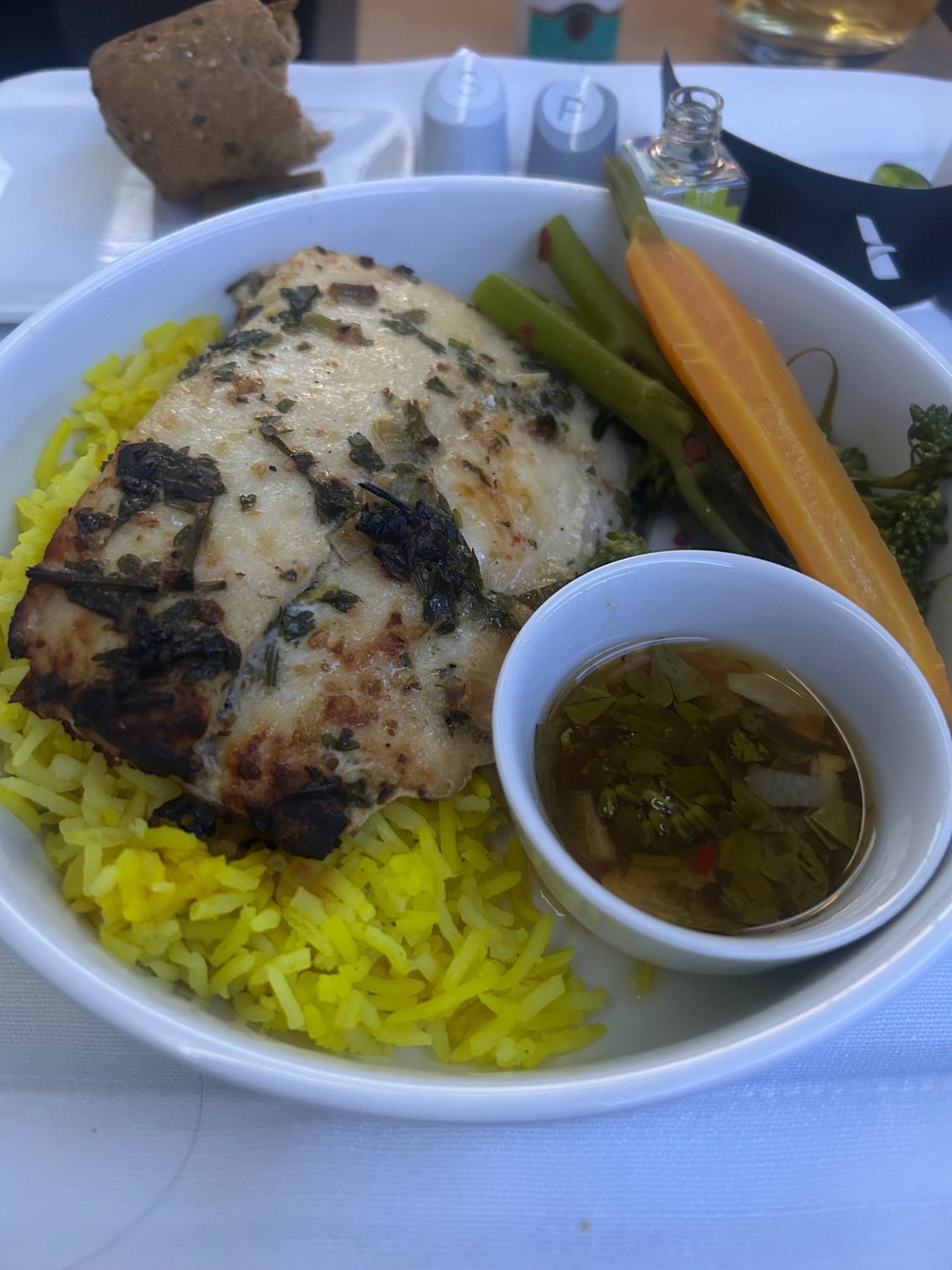 Seabass with Thai Chimichurri. Pretty tasty sauce and nice piece of fish. Pace of service was dire though. Starter / drinks weren’t served until 1.5 hours after takeoff. Dessert was served with only 4 hours left on a 7 hr 15 min hop. Wish I’d arrived to ORD a bit earlier and just eaten in the lounge. Could be due to crew getting used to the new aircraft.