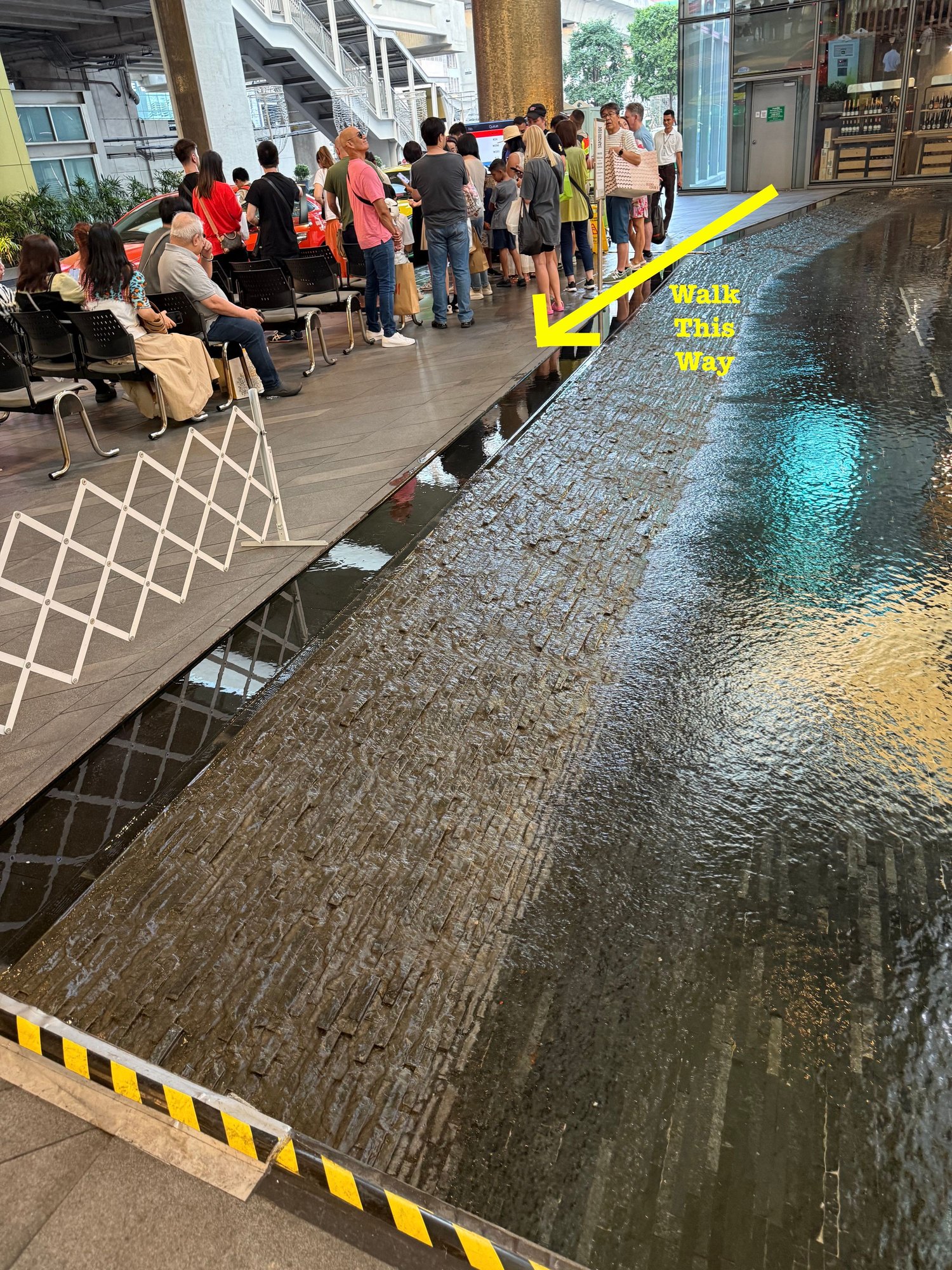 As we passed the group, you see that large black shiny strip? Well, then you're doing better than I am. What wasn't obvious is that it was sloped at a steep angle and very, very wet. You can start to imagine rushing past this group where my left foot may have gone, and due to the angle and water....where the rest of me soon went. Leg slid out from under me to my left sending all 200+ pounds of me sliding right down into the water feature with a loud thud. I don't THINK anyone managed to film it or put it on the socials but mall security did see and very quickly sprang into action.