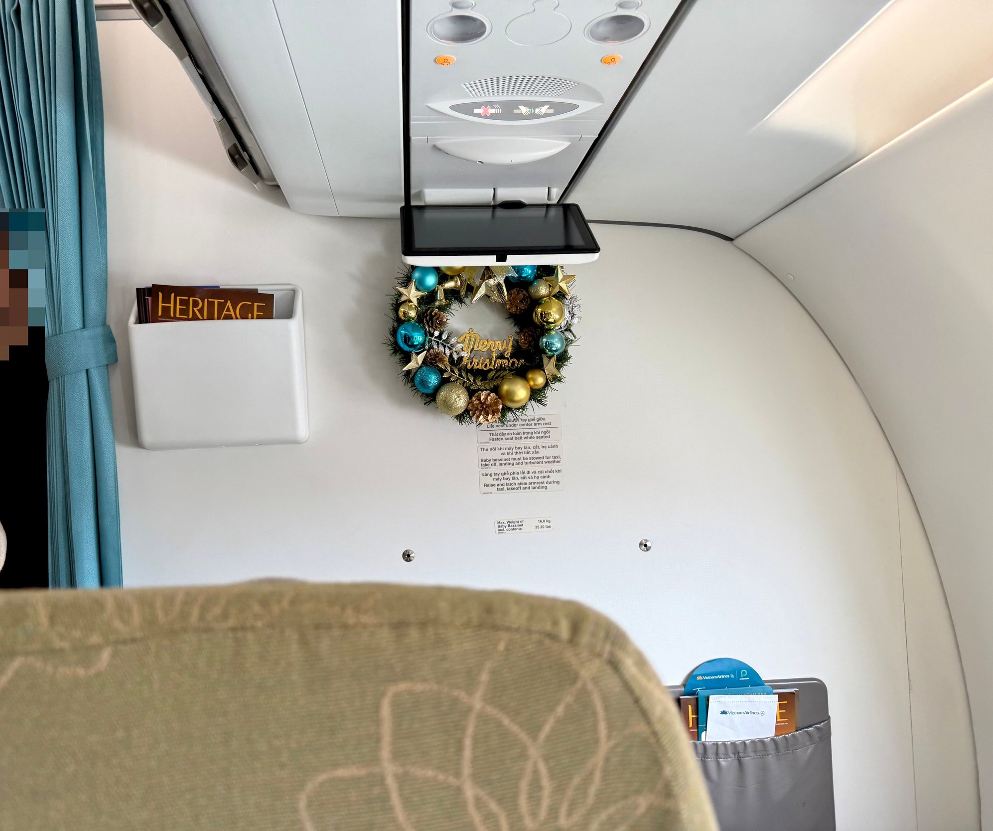 First thought upon boarding: I love how festive this plane is, all prepared for Christmas already! It did make me wonder...as much as airlines remind you everything must be secured and stowed for takeoff and landing, is a wreath on the cabin wall the best of ideas?