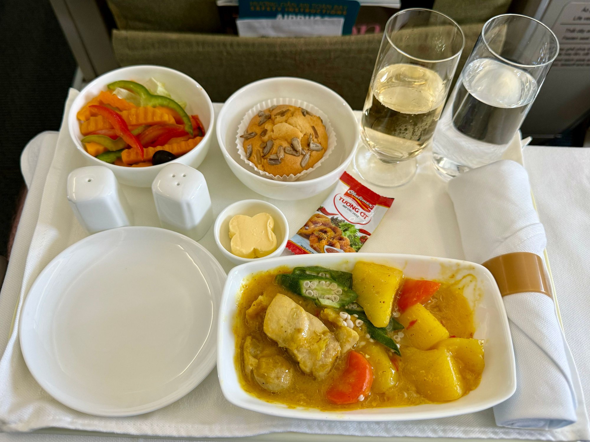 ...and with that off we go! The crew was quite lovely, all smiles, but their service was a bit on the "shy" side. I don't know if this was a lack of comfort in English, or in dealing with western passengers, but they just felt shy. Not in a cold way, but...they were still wonderful. Meal choices were "chicken or beef" and I went with the chicken...although I have to say it was pretty meh. I was hoping for something a bit more local, but unfortunately not (and the beef looked even less appetizing) but hey...at least the pineapple muffin was tasty and champagne refills were proactive and plentiful...definitely more plentiful than I wanted/needed but the crew practically insisted!