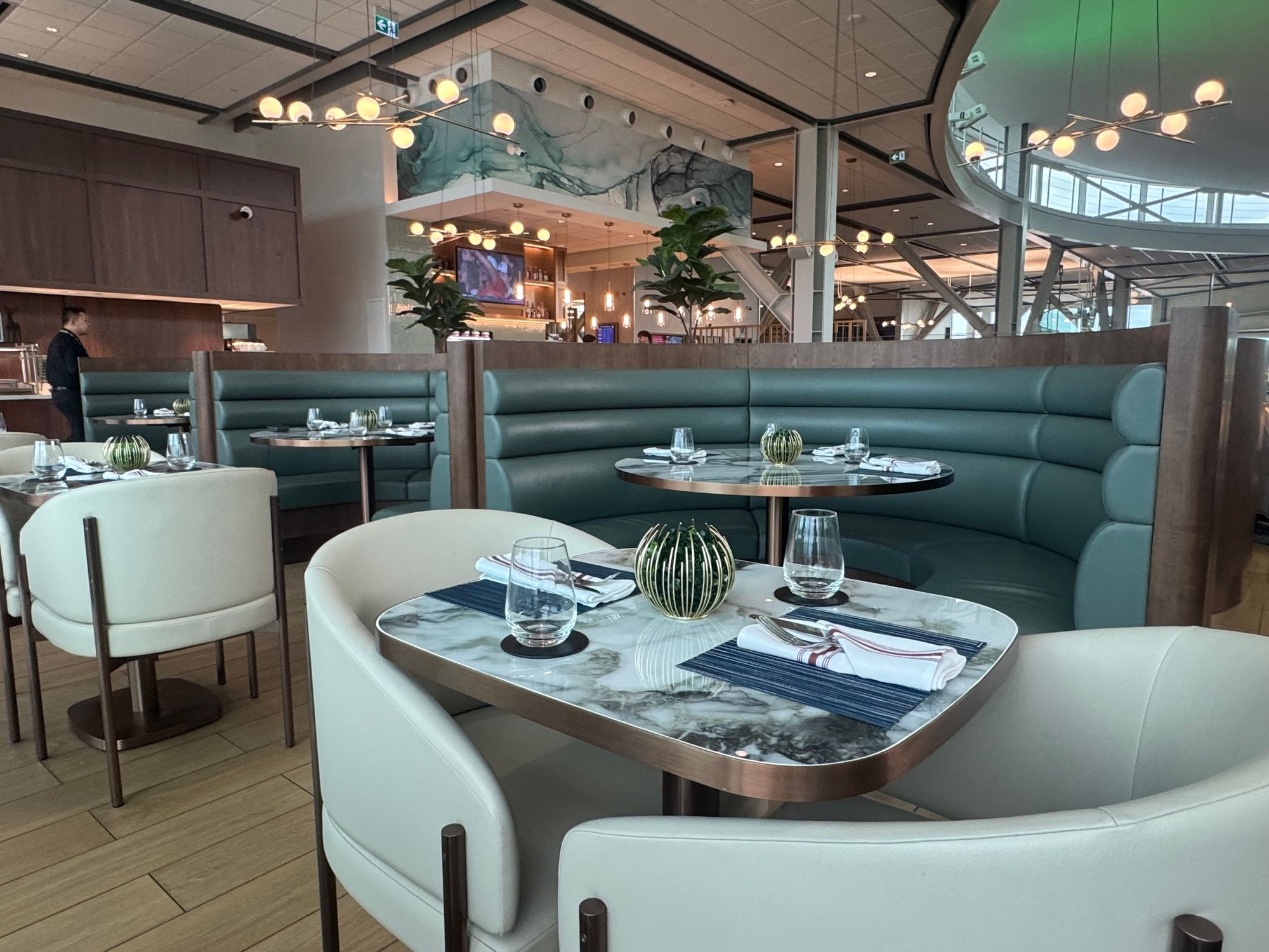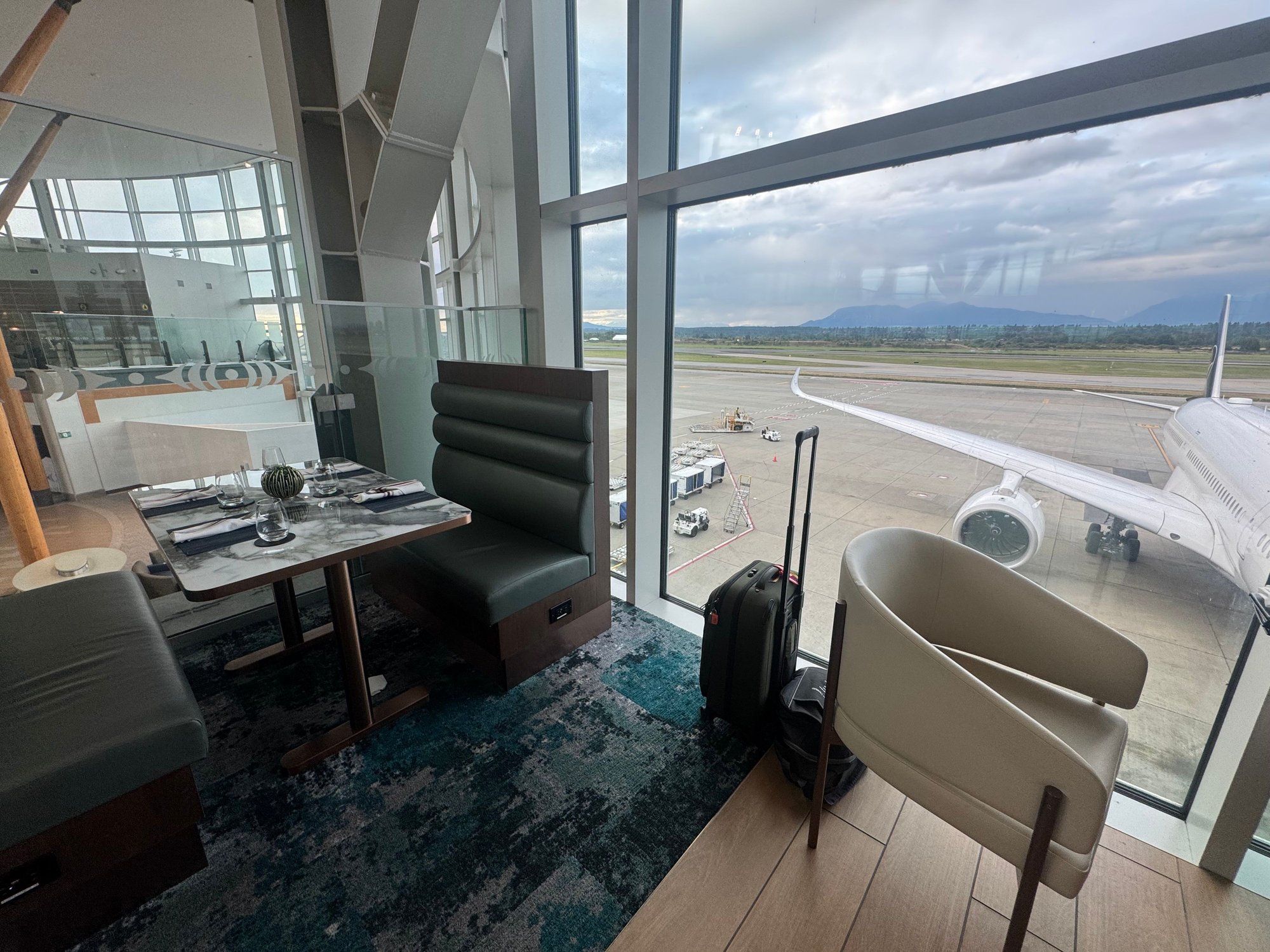 We’ve just been through YVR and I have to say that I was sceptical about the lounge but was really impressed. Lounge is opposite Gate 58 and BA were leaving from 62 so pretty convenient. We got the lift up with a lovely family of four. At the desk they were shown to left to the Plaza Premium Lounge after a boarding pass scan. We were given the Maple Leaf stamp and shown to the right to the Plaza Premium First Lounge and given two menus and told to sit wherever we wanted. At 18:30 the lounge was quite quiet and we got a table for two at the window overlooking a boarding Lufthansa A350. Drinks menu is ok - no champagne and Mrs JP finds Prosecco too sweet but had a Mimosa which she enjoyed. There was a buffet for those of us who prefer that but we ate from the menu and the food was good. I had the Lentil Paella and Mrs JP had the Salmon and then we shared the chocolate dessert. All very nice.