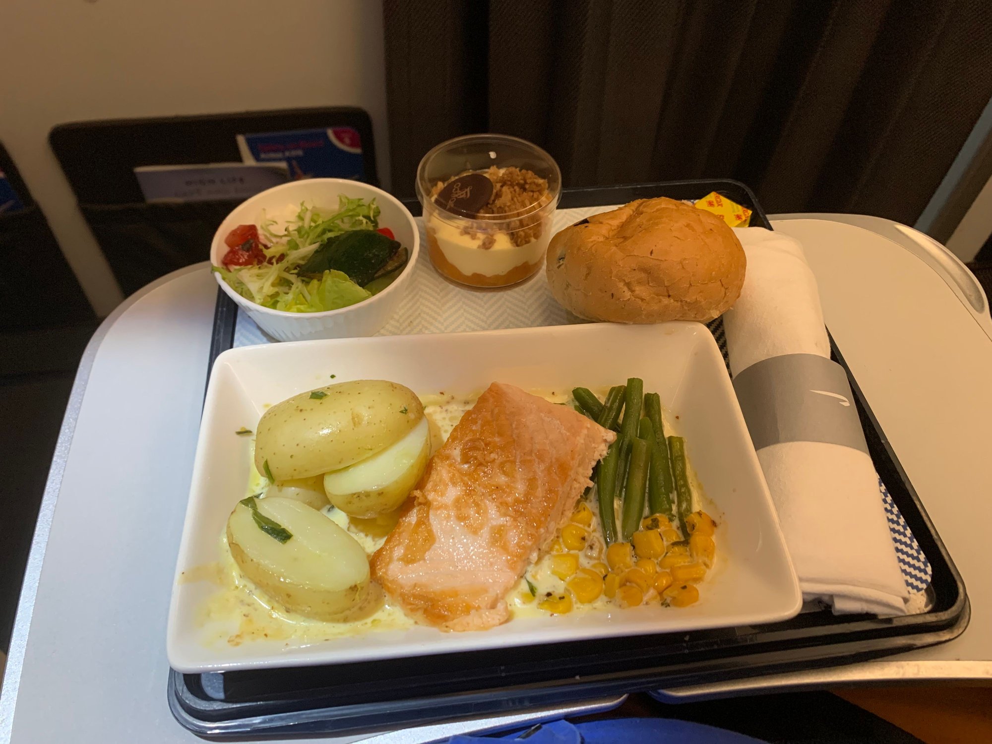 As usual there were no menus. The choice was Pasta, Salmon, or a cold salad. We had the Salmon. It was just the right thing to serve on a flight leaving at 20.40. The crew were most pleasant The Champagne was Trouillard (nearest translation « Scaredy Cat » was well chilled. Good service all round by a highly experienced crew.