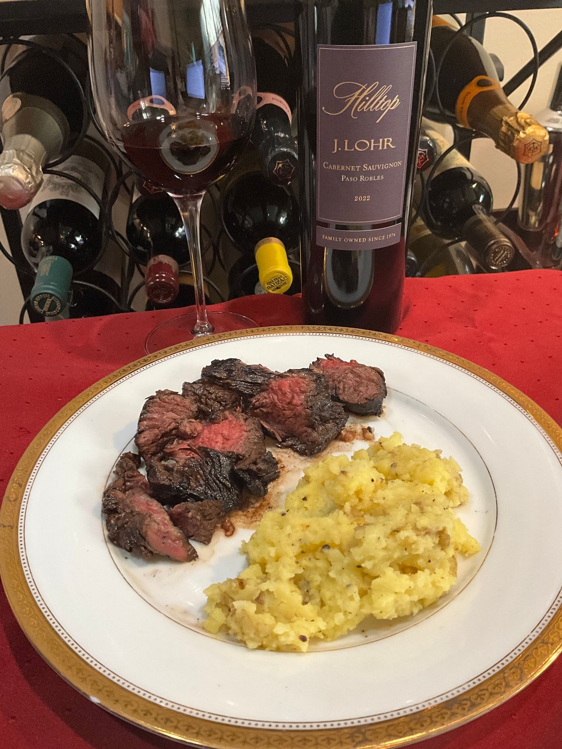 Back from my trip and decided to dig into my stash of frozen foie gras medallions and since the bottle of 2017 Sauternes is a full bottle there’s going to be a few (likely three) consecutive days of seared foie gras. I know I wasn’t aesthetic with this dish, but, it’s very flavorful because a vintage port balsamic reduction is added amd it’s accompanied by fresh pineapple that has been simmering in vintage port and aged balsamic. Main course marinated hanger steak and smashed black truffle yellow potatoes with a 2022 Paso Robles. The hanger steak was seared in the same pan as the seared foie medallions with the remaining foie gras fat.