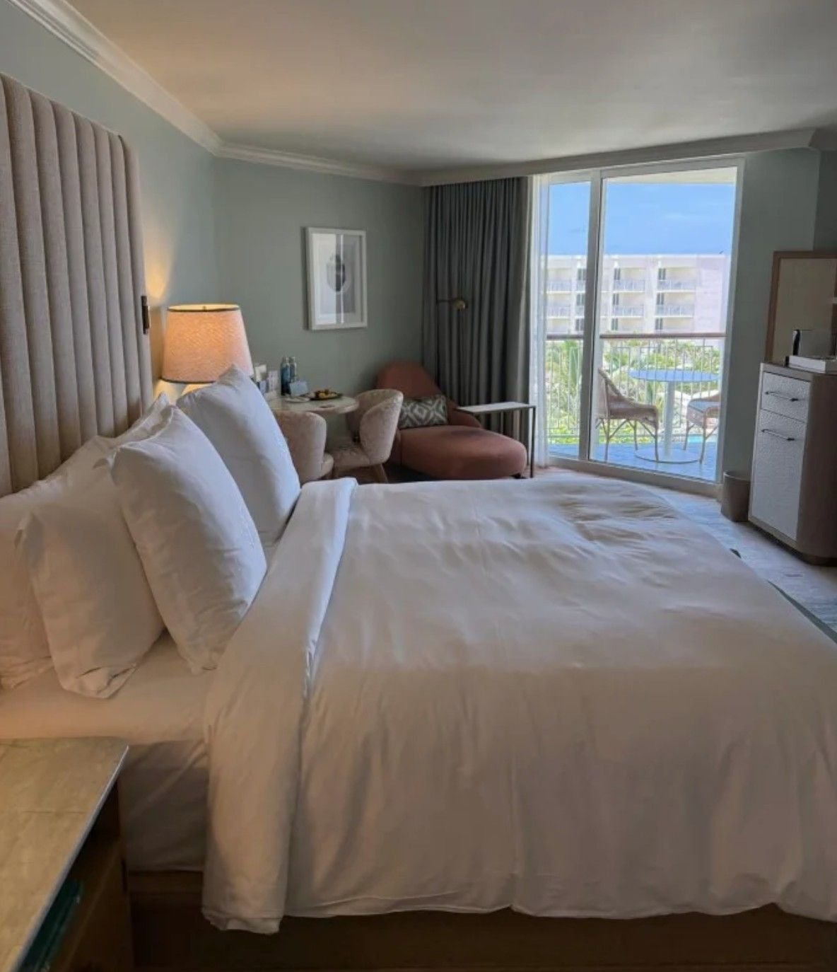 The resort has 207 accommodations (193 guest rooms, 14 suites), with standard rooms around 393 square feet. The coastal-inspired decor, pastel carpets, light curtains, and plenty of natural light, feels airy and tied to Palm Beach’s style. I booked a Palm View Room but lucked ou