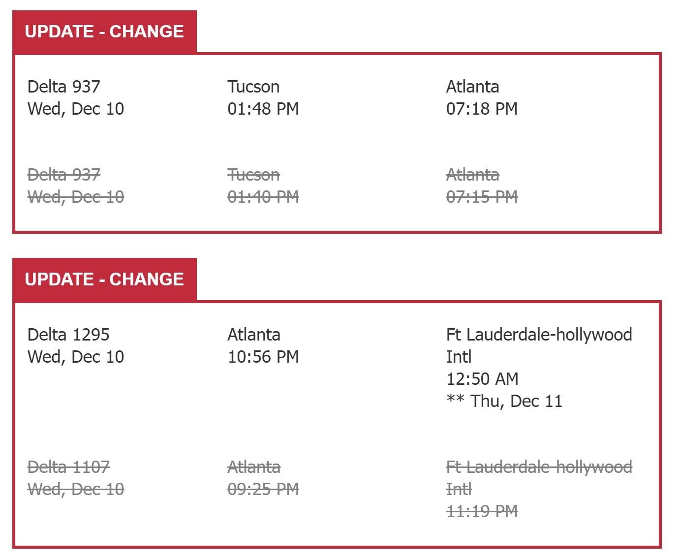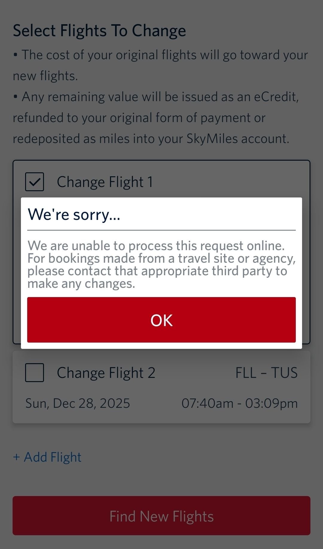 I booked round trip tickets from TUS to FLL using my reserve card companion pass in First Class. I adjusted our travel dates in order to use the pass to purchase first class seats. We leave December 10th and return on December 28th. On August 30th I received a notification that the flights have been changed. We now arrive into Fort Lauderdale on December 11th at 12:50 a.m. This will put us checking into a hotel downtown after 2:00am after getting our luggage and Uber. This is not acceptable to us. I have tried to do the Change flights online but I get the error code I have attached below that says this flight was booked through a 3rd party or travel agency ???? and I need to contact them for assistance? The booking was made online using the Delta website. The really odd thing, I looked online to see what flights were available and found the same flight departing Tucson with a layover of 2 hours in Atlanta and arriving in FLL at 11:25 pm. which is basically the same flight we were originally booked. What is the best way to handle this? We obviously want to keep our first class seats and get back on the earlier flight.