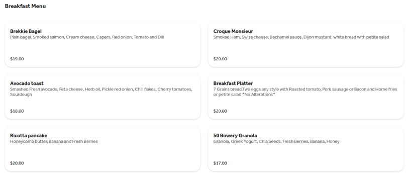 Monday it was prompt, as in ~25 mins, which is what the hotel said to expect. The next 2 days were close to an hour. I don't have time for this, especially if you can't place your order until 7am. Day 2, I thought maybe it was an off day. Day 3, it was the same as day 2. Day 4, I said screw it, I'm not going to bother. The food was mediocre at best. The croque madame was OK (pictured below), the avo toast could not have been more bland if it tried. Not gonna lie, the best thing I ordered was the side of bacon.The restaurant also couldn't/didn't honor basic requests like "add hot sauce," but just gave ketchup. Note that the menu pic only includes the mains, not any of the sides/drinks.