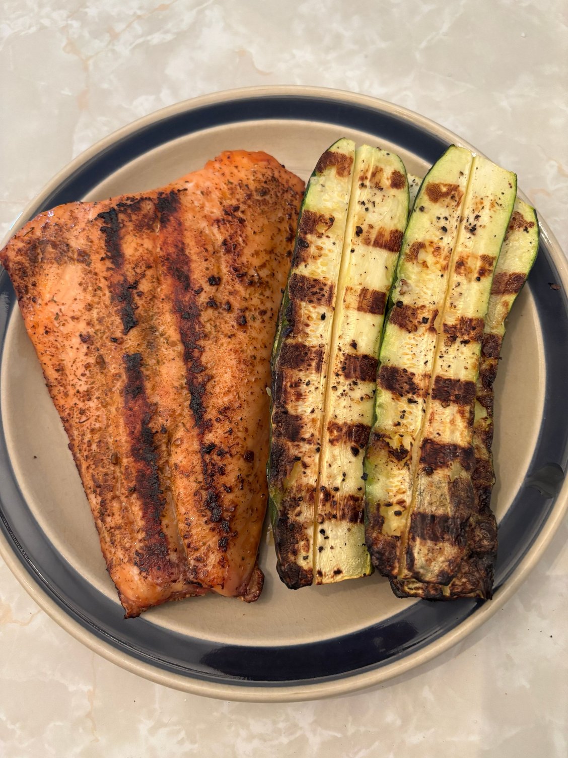 Lightly smoked salmon and zucchini off the grill and waiting to be plated.