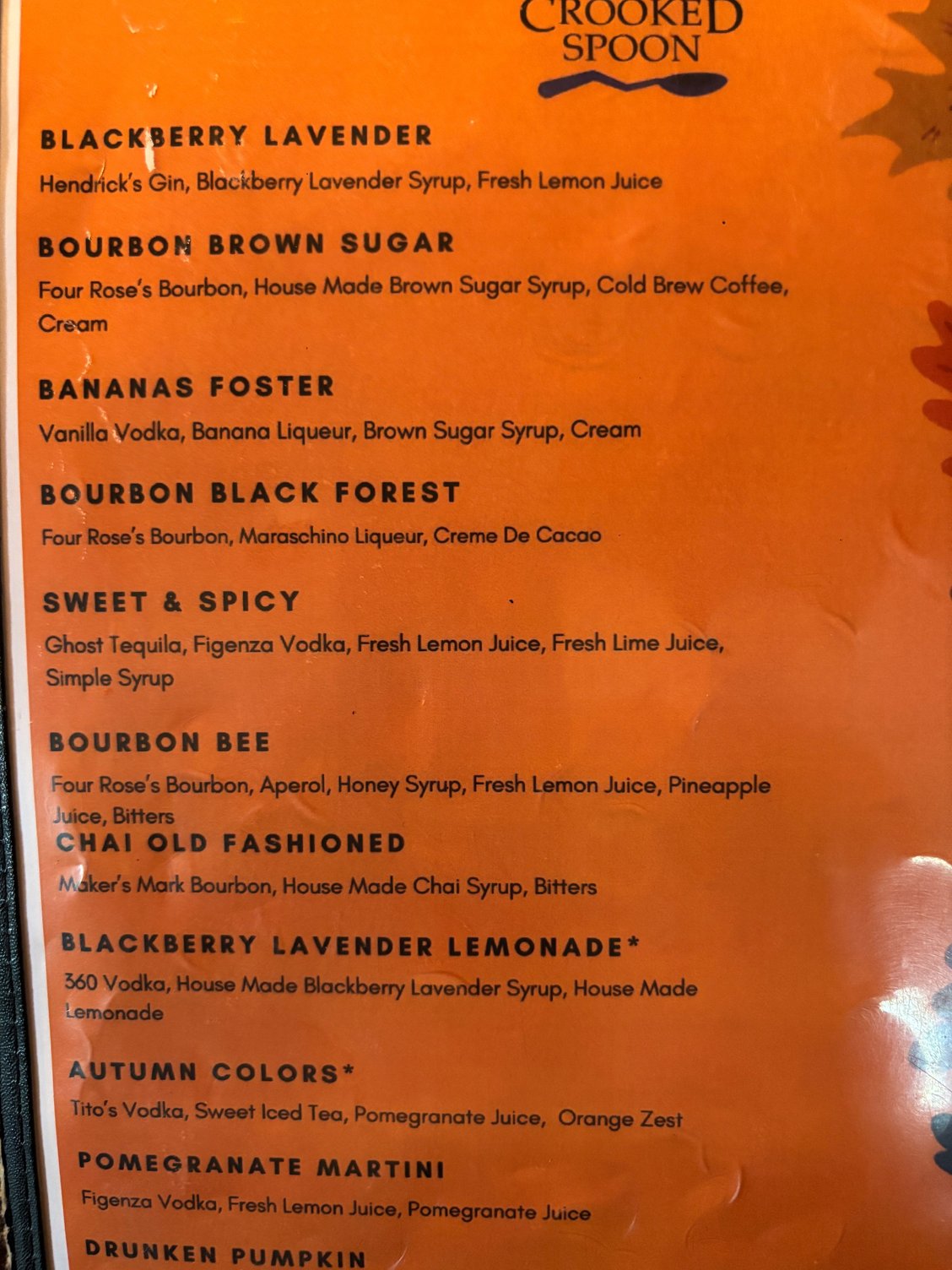 Fall drink specials. I cut off a couple. The glare from overhead made photos challenging.
