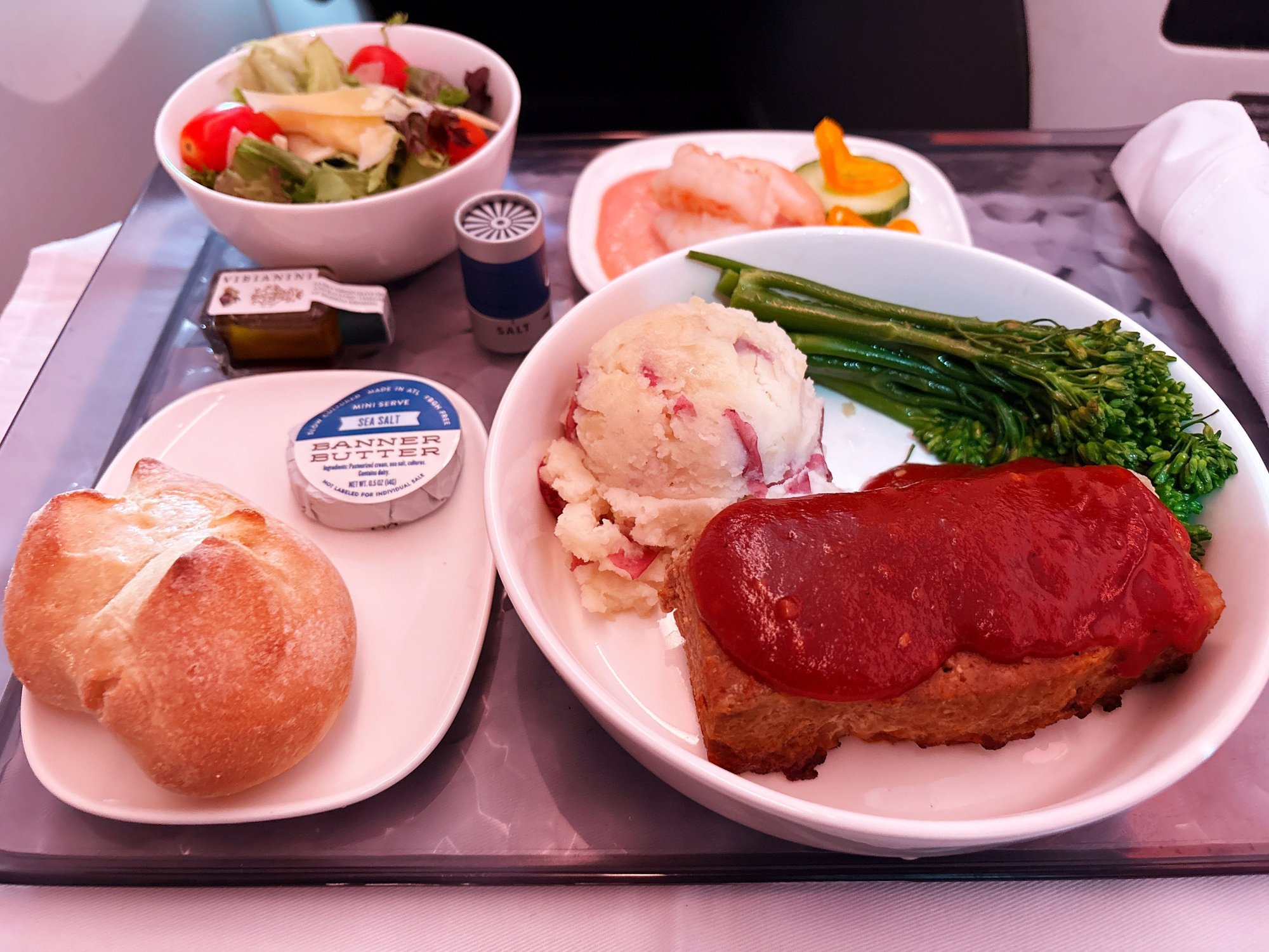 Here’s one of the limited selections from HNL-JFK last night; a meatloaf with a ketchup sauce (which I would ask for on the side, if the FA were able and willing):