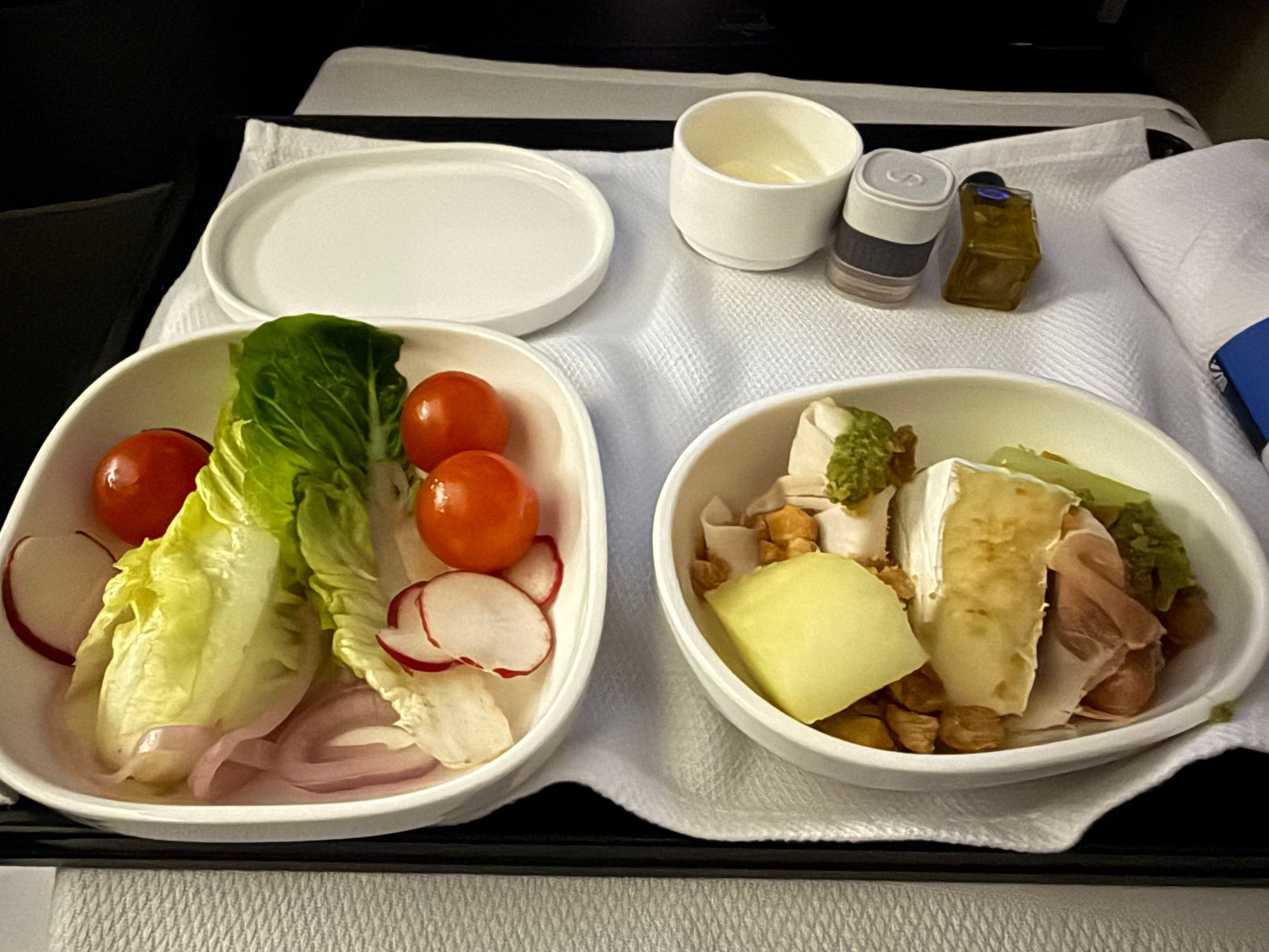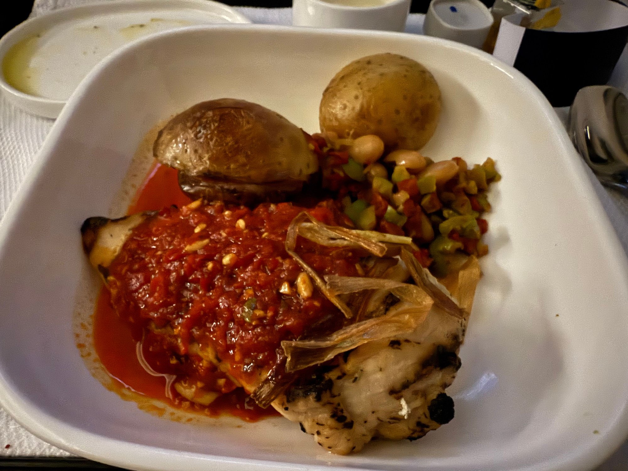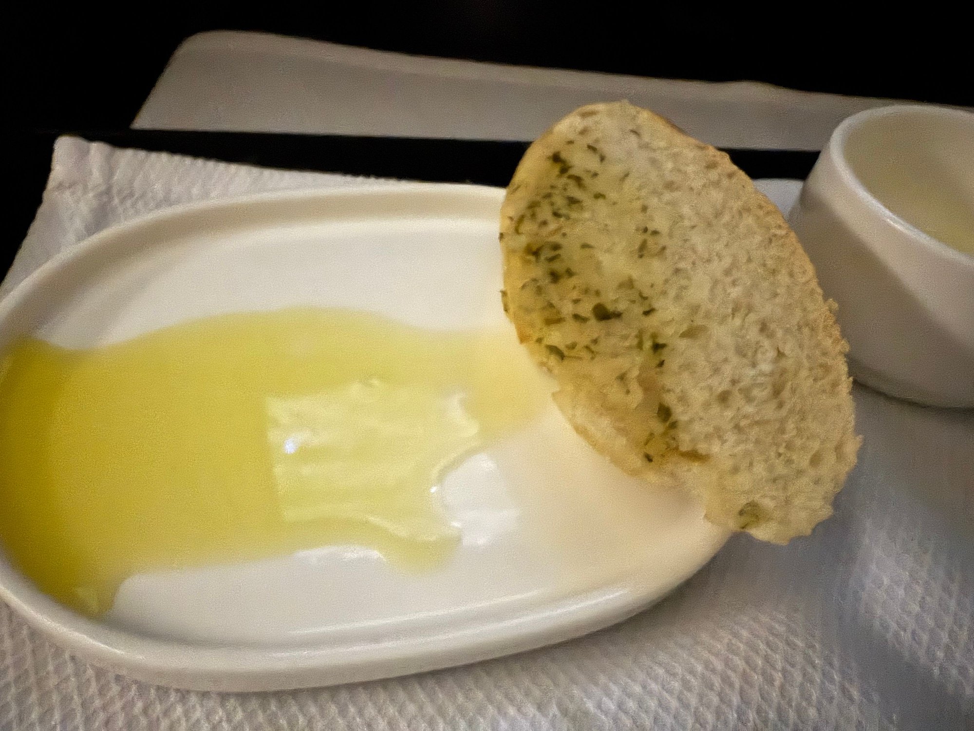 App and salad were pretty terrible. Salad was mostly one giant uncut stalk of lettuce. Prosciutto and cheese app was not a bad idea but just didn’t work. Cheese was hard, prosciutto was especially greasy. One small piece of mostly unbuttered garlic bread was a disappointment given I was in last row, basket was full, and it was never offered again. (Yes, I suppose I could have asked for another piece but FA dropped one piece on my plate and was off in a blur.)