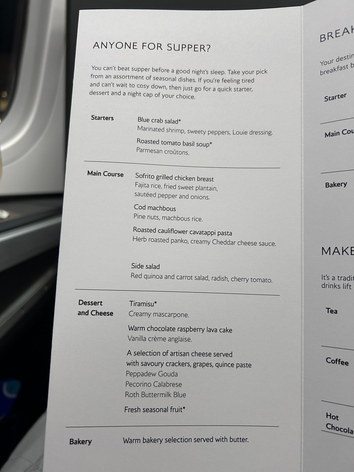 2235 / 0435 dinner. Disappointed to hear no sparkling water. The Customer Excellence Manager is gonna hear about this!! Crab to start.