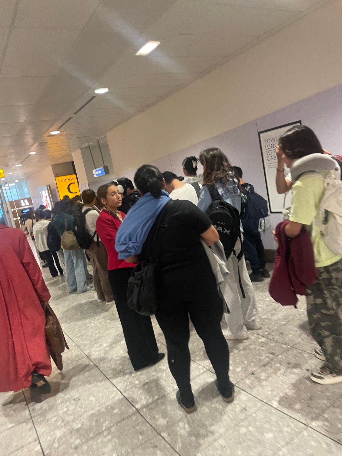 Staff downstairs managing access to the Cathay Lounges this evening. Operating on a “5 out 5 in basis” - queue here