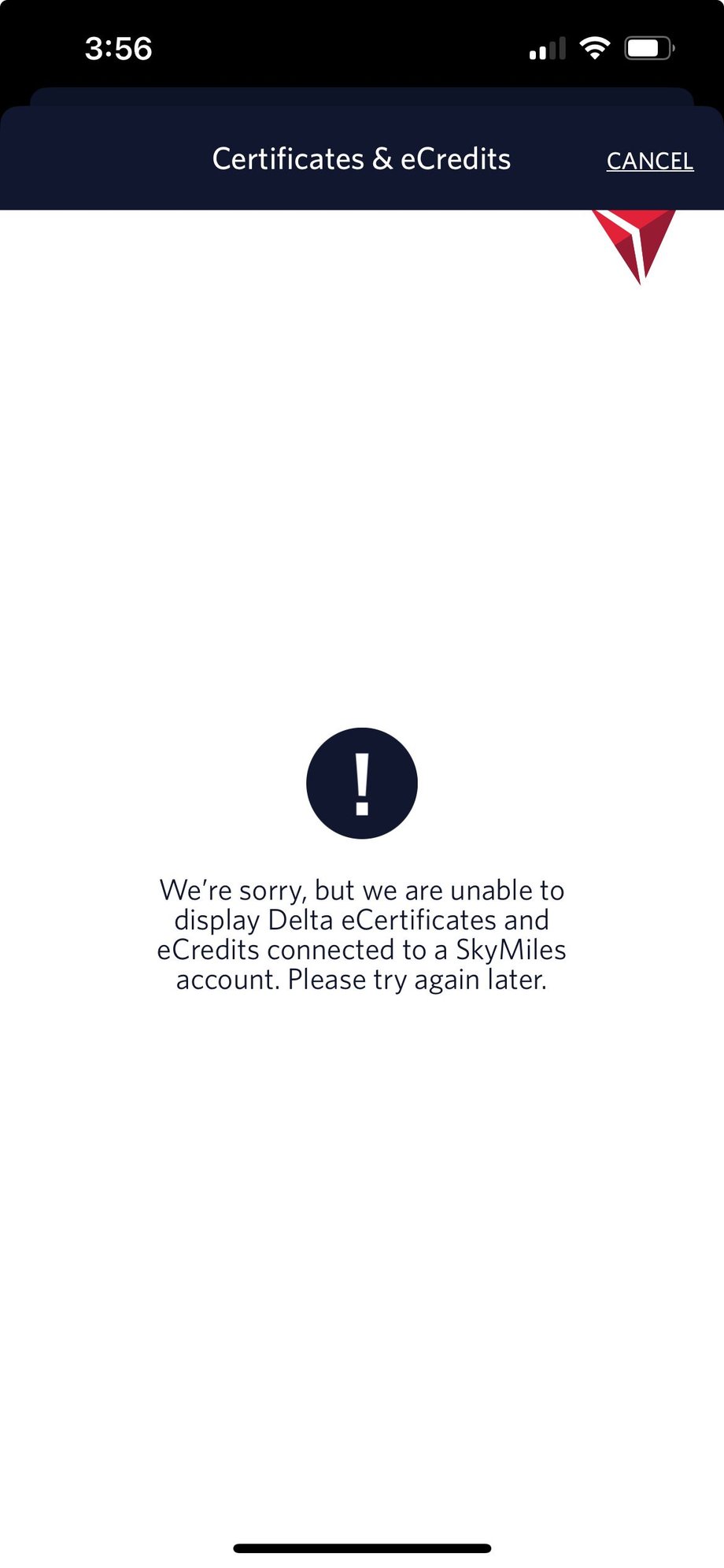 For over 2 weeks, I have been unable to view any certs or e-credits on the the Delta app or the website. I get a similar error message on the web version, this really makes using the benefits even more difficult! Anyone else getting this error? App is updated and current version.