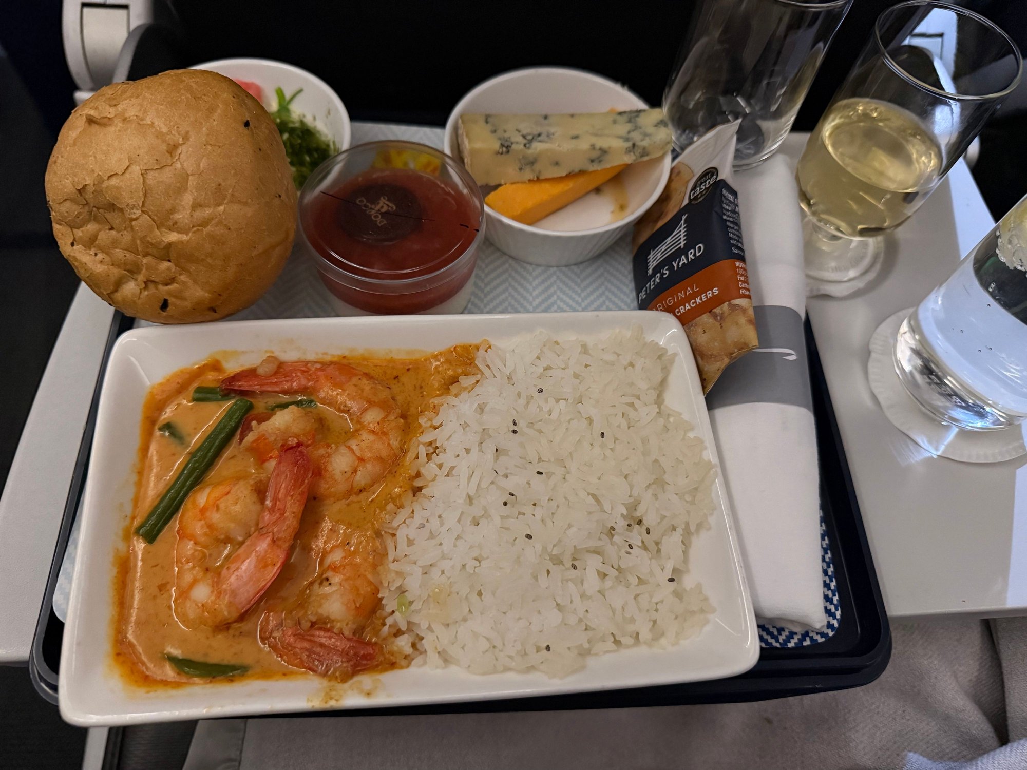 Slightly delayed departure. Decent crew, tasty starter and prawn curry with plenty of champagne and red wine provided. No menus provided on this flight which IMO would have completed the finishing touch.