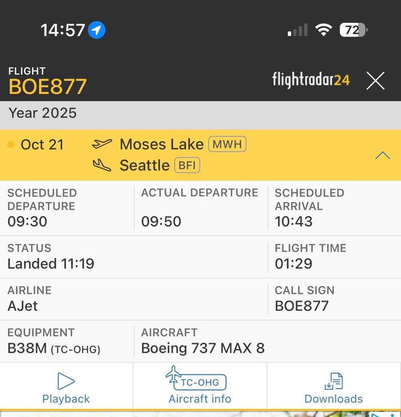 FlightAware and FR24 show an Alaska 737MAX8 arriving BFI at 1105, one belonging to AJet at 1119, and a third belonging to Hainan Airlines at 1210