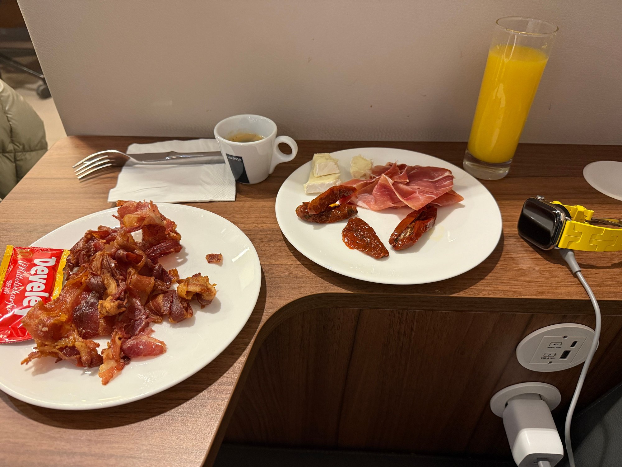 This one was really crispy, almost like a chips from bacon. But tasty. Fresh OJ and some coffee. I still have more that 30 minutes till boarding, so I will eat something more, to leave the lounge quite full.