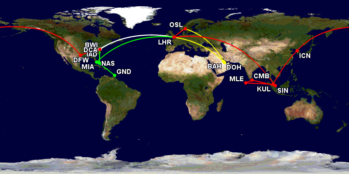 Great Circle Mapper tells me this is a frankly absurd 46,332 miles including the positioning flights - in other words, roughly 1.9 laps of the equator.