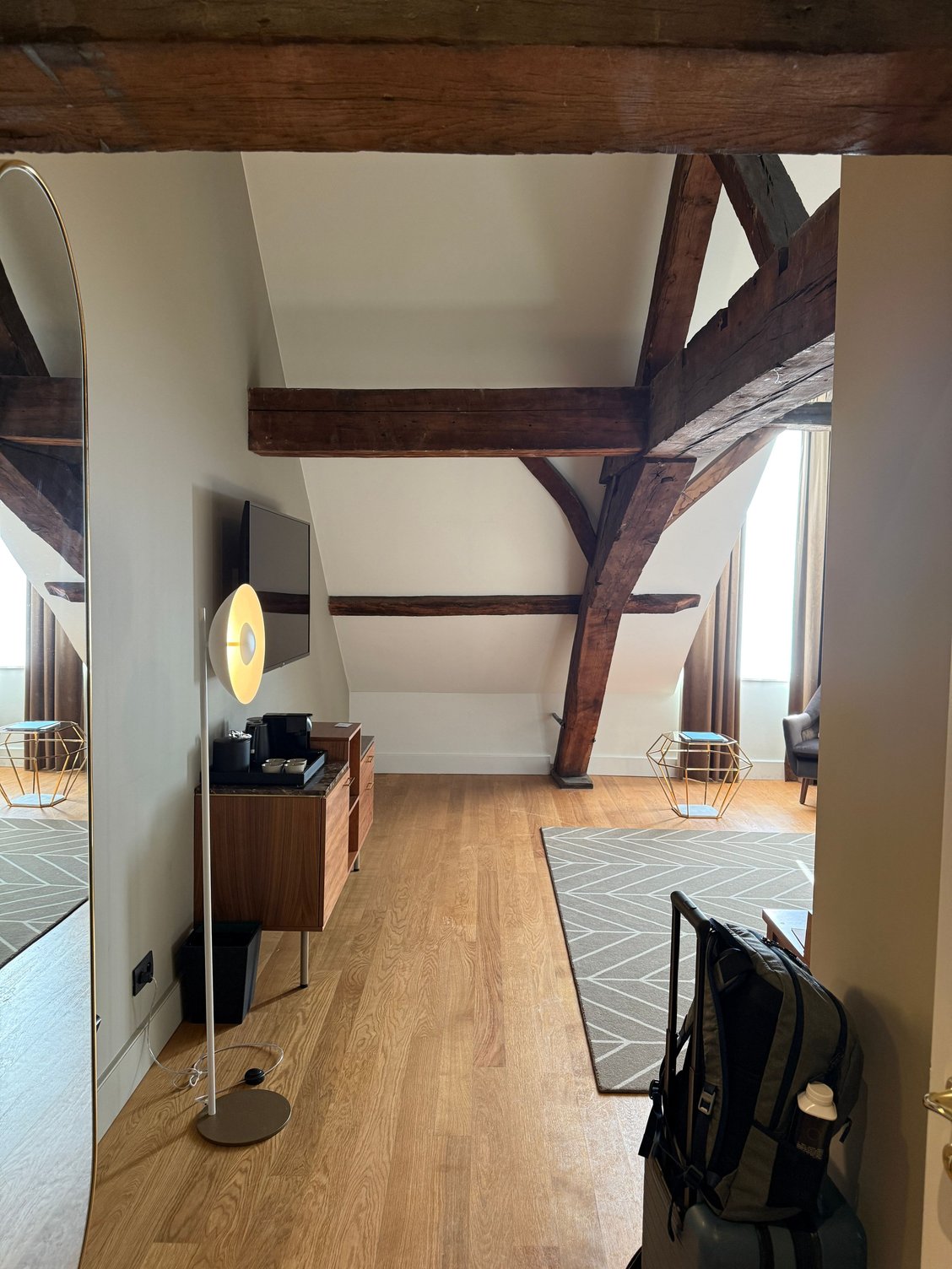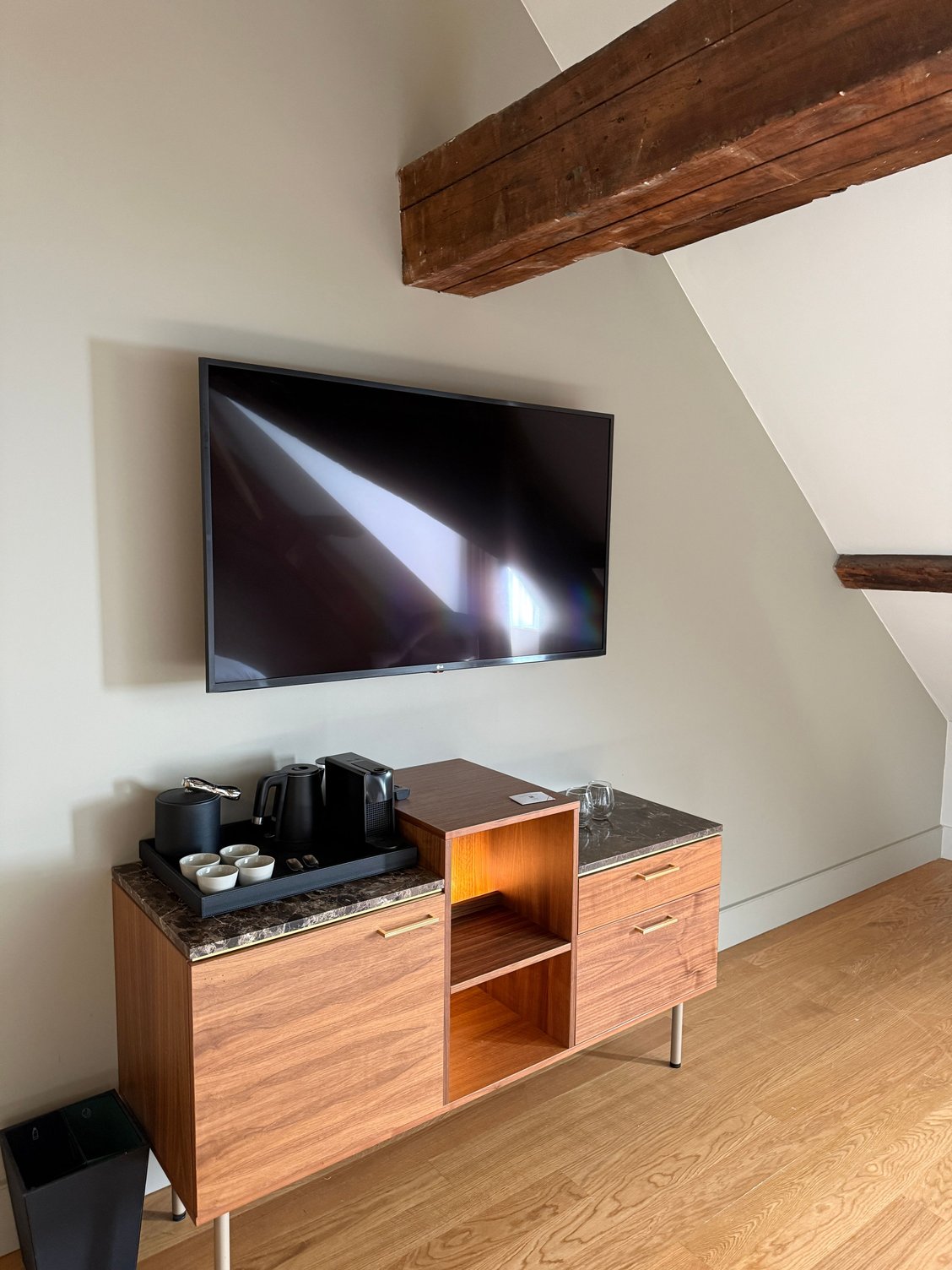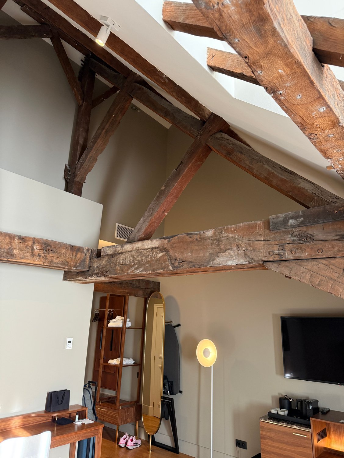 - The wood beams in my attic room are visually interesting