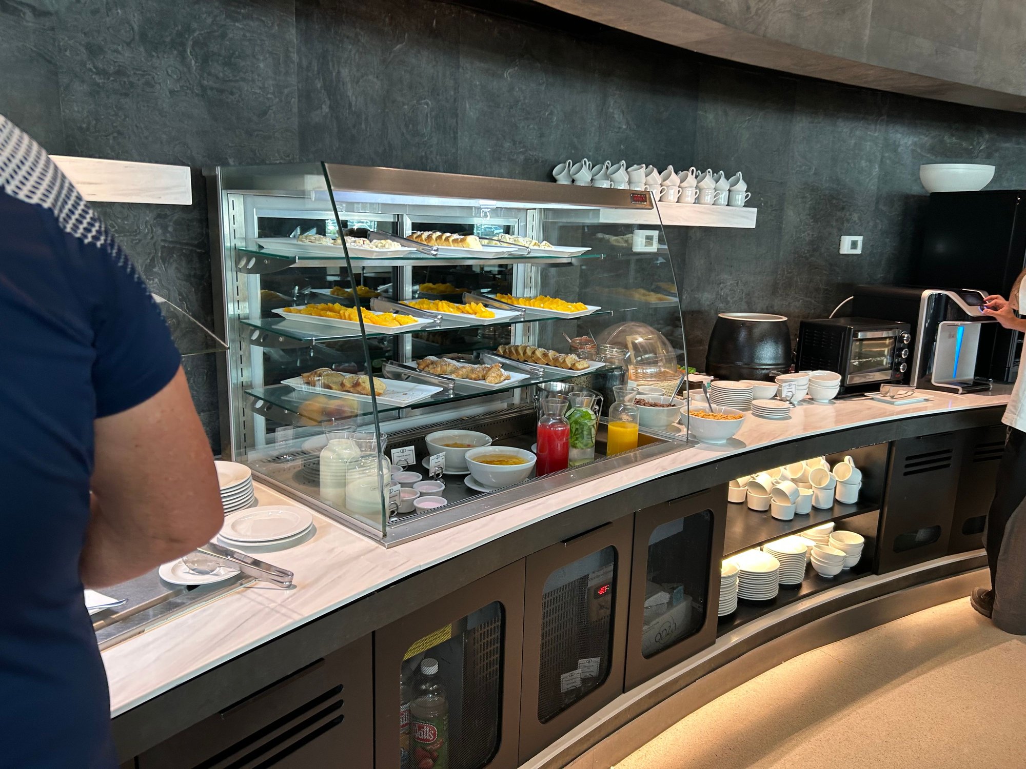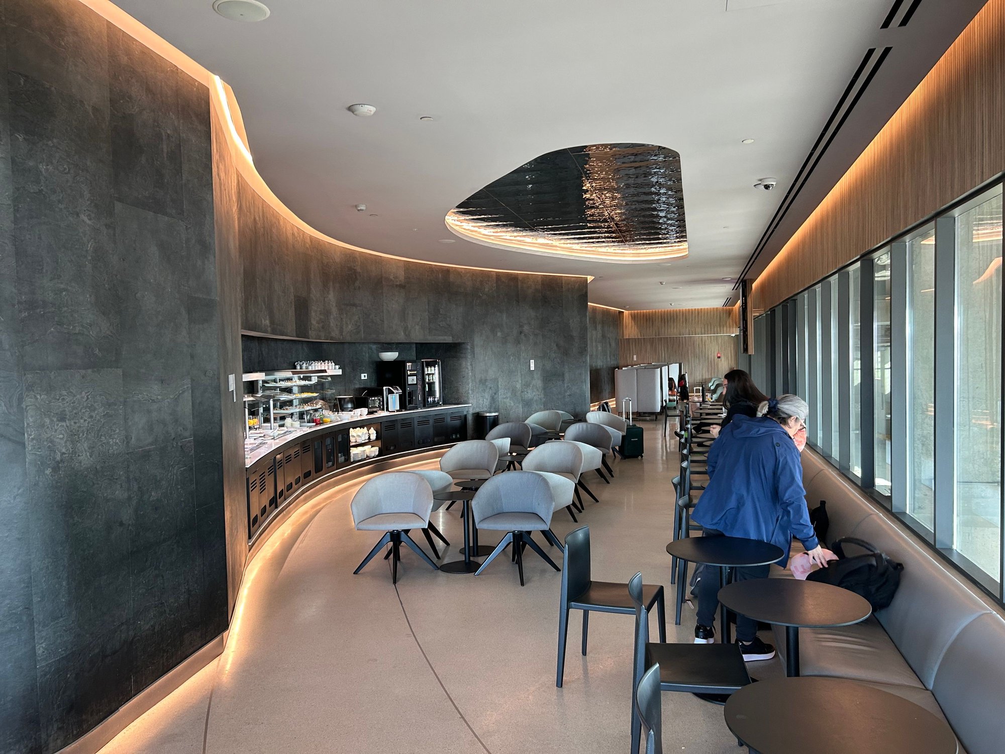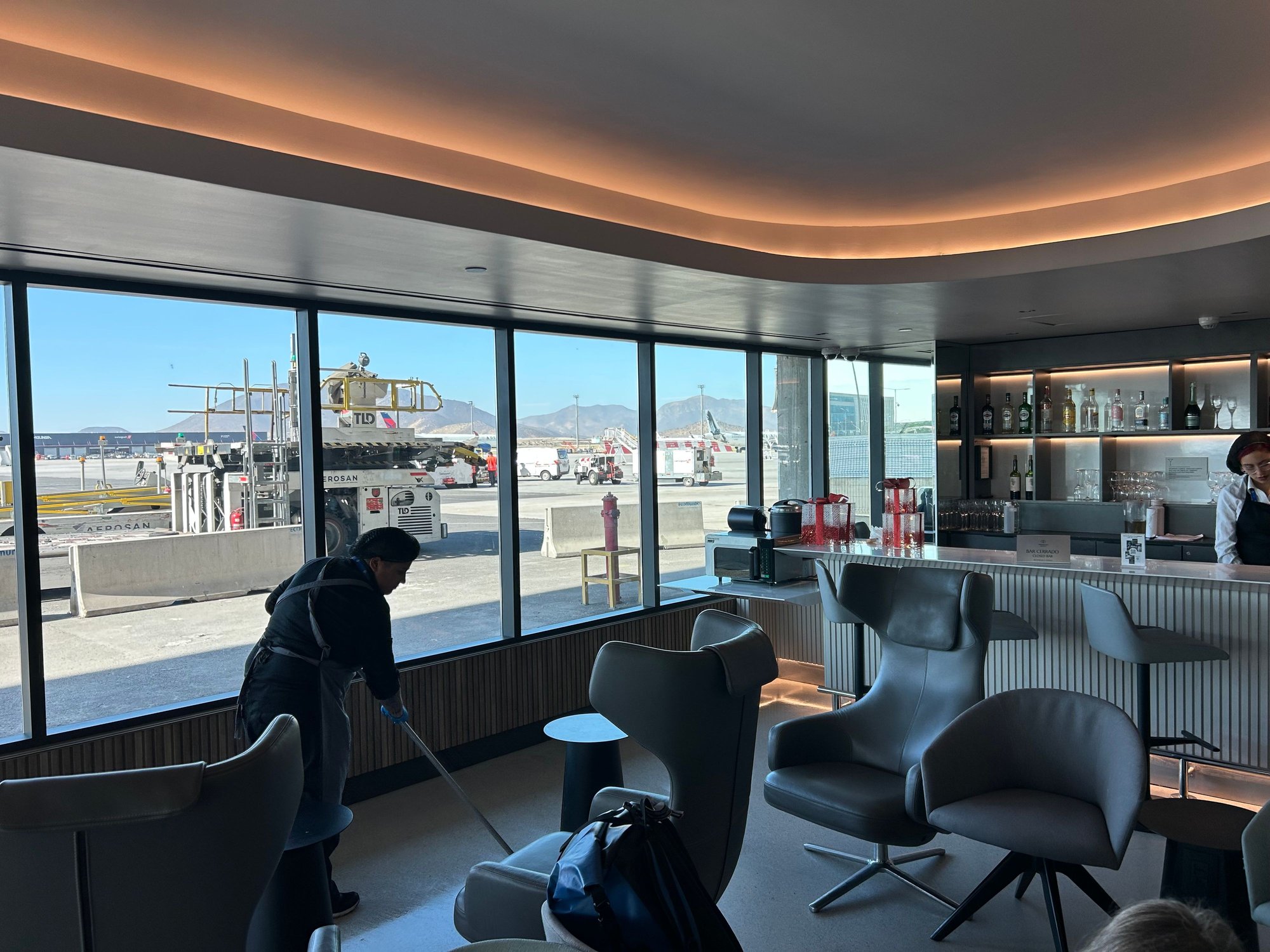 I have to say it is pretty grim - the photos are way better than real life. 90% of the windows face a concrete overhang and a perfect view of a car park. One corner has an apron view where we had to ask for the floor and two chairs to be cleaned. We will try to sit here for two hours. But we will fail. The main terminal is SO much nicer.