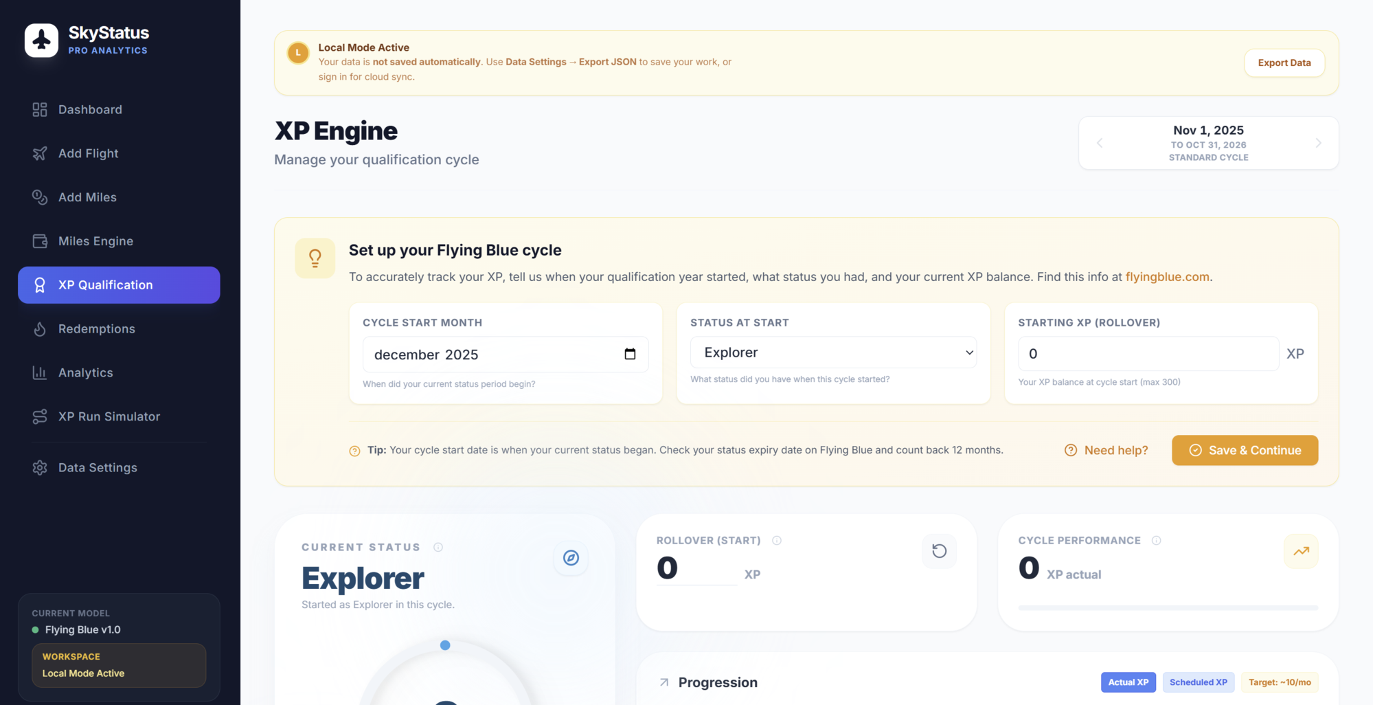 That’s great feedback. I’ve made it much clearer for first-time users. I’ve also simplified the entire onboarding flow: you can now just drop your Flying Blue flight history, which you can download from Flying Blue, straight into the system. The exact match with your current cycle start can’t be manipulated through the instructions though.