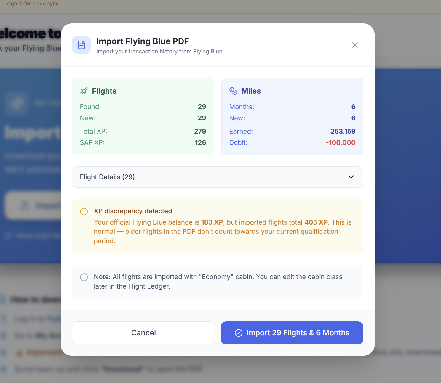 Either way I've been platinum for longer than the PDF export, so getting old data is going to be near impossible (I do have the flights logged in Flighty, but not the XP and miles movements), perhaps the import should only consider "complete" data, in my case 2023 and newer (since the first "XP Counter offset" in the data) - and warn that older data needs to be manually added.