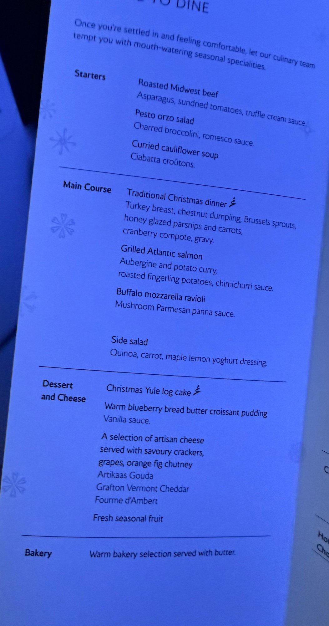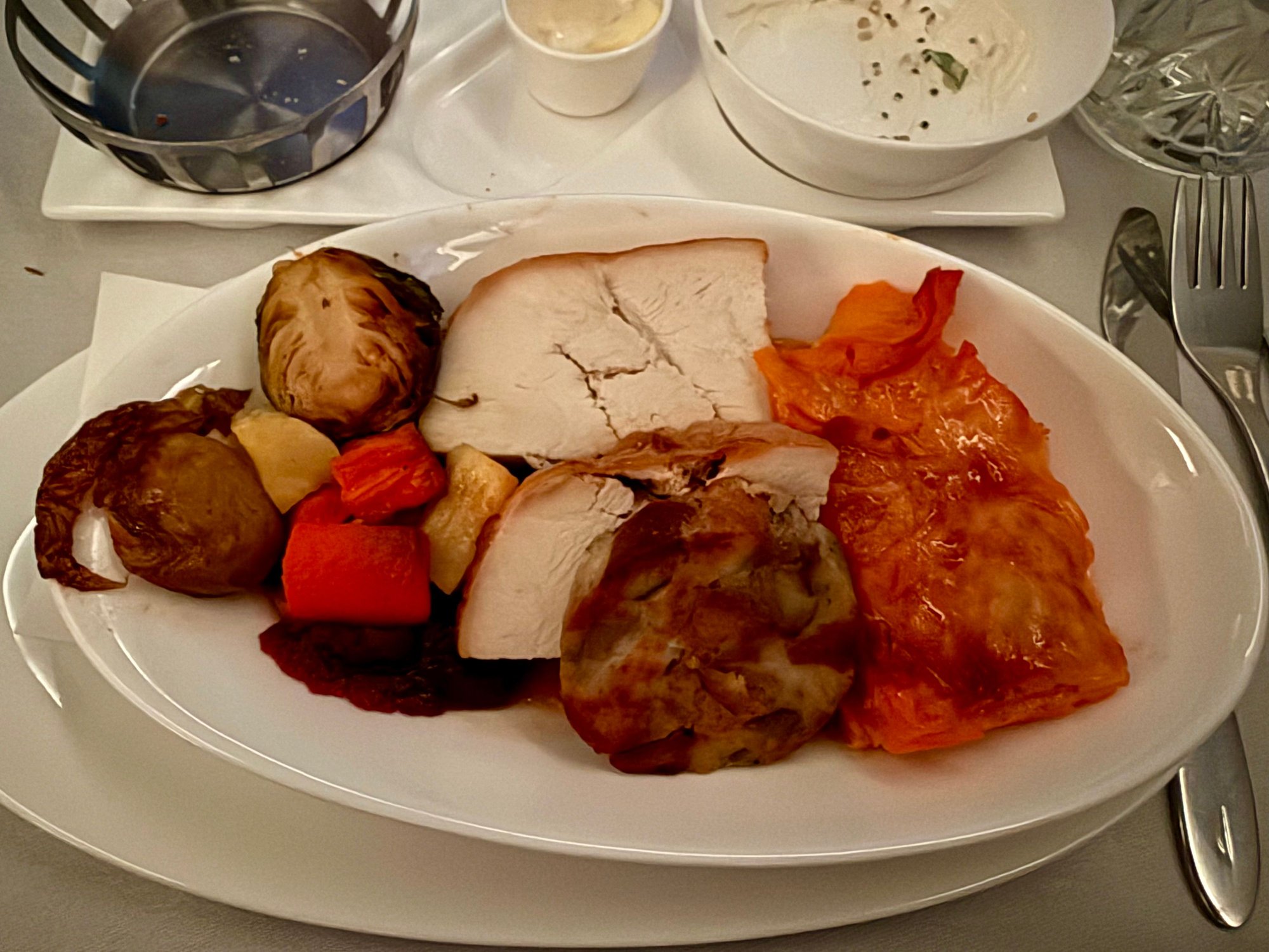 Middling Christmas menu meal out of JFK. Pdb of champagne or oj, initial drink served with mini Penn state pretzels which I found a bit cheap, really good roast beef starter, pretty bad Christmas dinner with the turkey dry as a catchers mitt and nothing really having any taste, decent cheese and delicious warm dessert (served after the cheese to make sure there were enough). Pretty mediocre and cold crew, but at least they were able to finish up meal service in 90 mins, so that’s a win in my book!