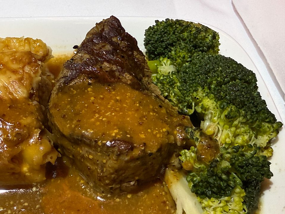 Served with grain mustard jus, potato gratin, and steamed broccoli
