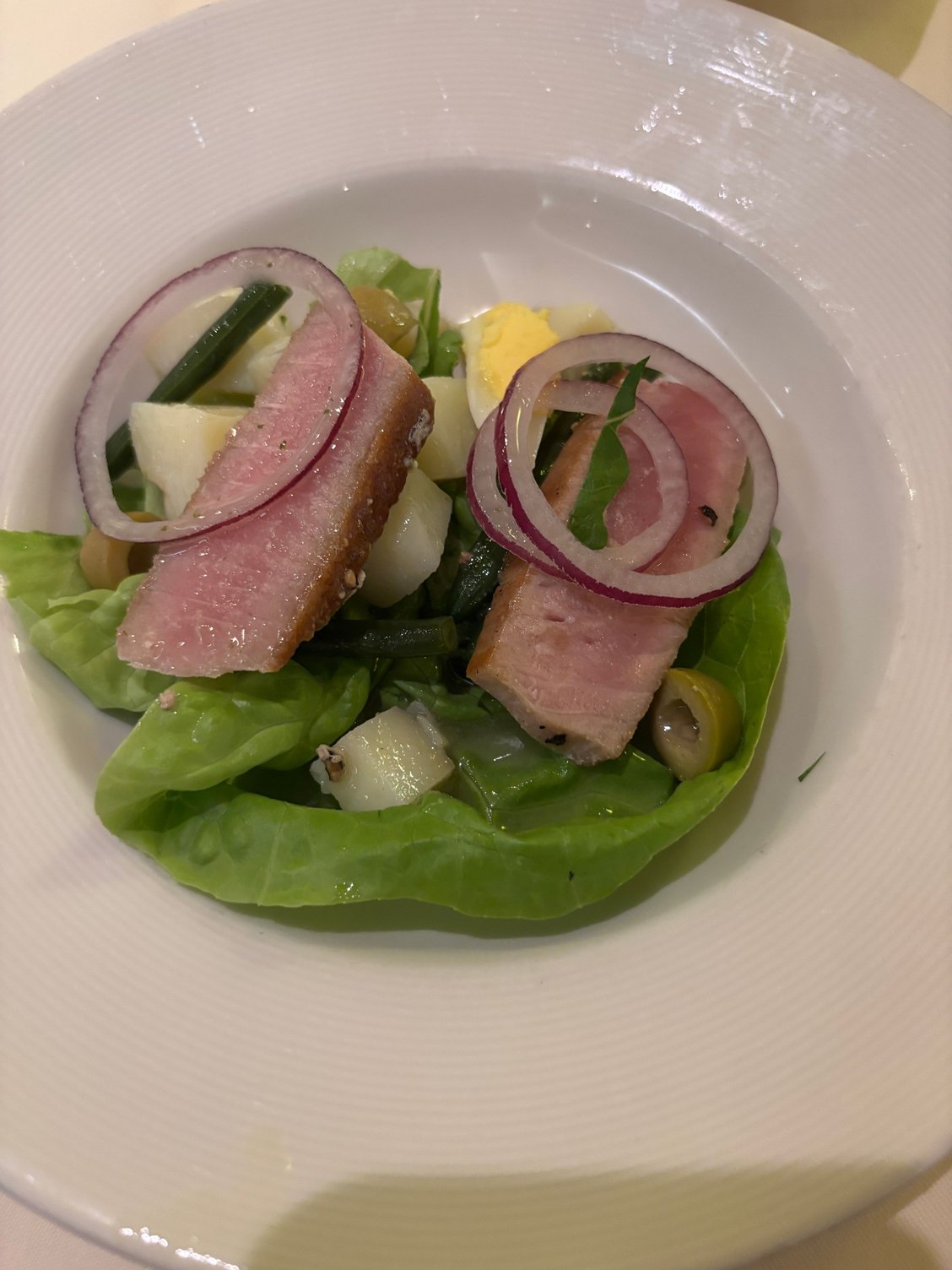 Salad nicoise to start. My entree of sea bass was not photogenic. They brought me dairy free coconut cream pie for dessert. I’m gonna get fat if I’m not careful.