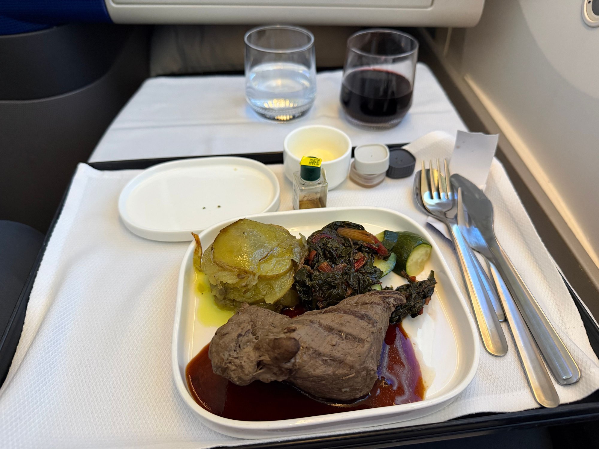 Had the exact same meal EWR-NRT on 1/22. My steak was even a similar odd shape mine and was 102% well-done😂 Looks like we got the sundae too! The chicken tapas were OK while the Empanadas were bland. The eggs were fine but I didn’t particularly want breakfast at 2:30pm Tokyo time? Fruit was tasty though. The Crew also referred to the mascot as a blend. ANA lounge was quite the disappointment but the shower was nice at least.