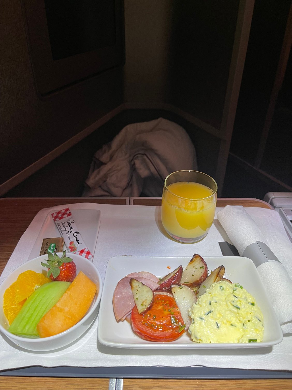 The prearrival breakfast on dfw to BCN is pretty good, these eggs are light and fluffy, they taste like they were scrambled with milk or cream. Could have used more seasoning though, I added pepper.
