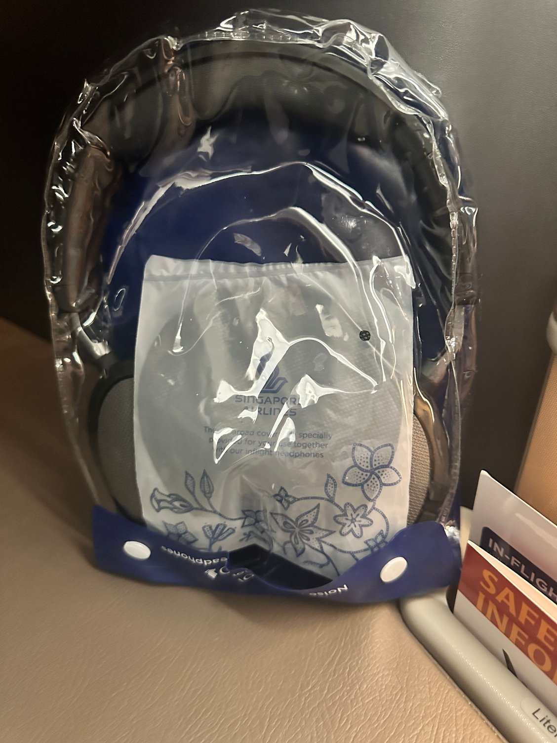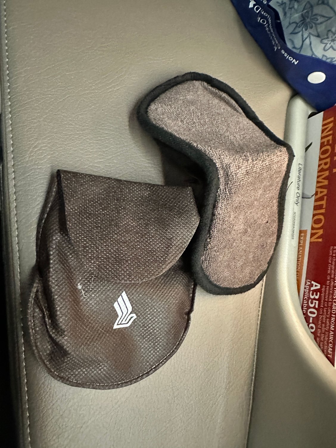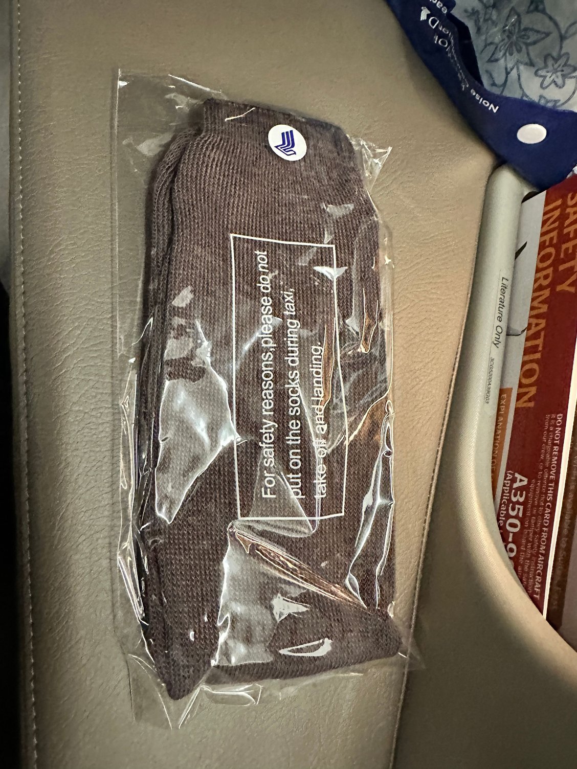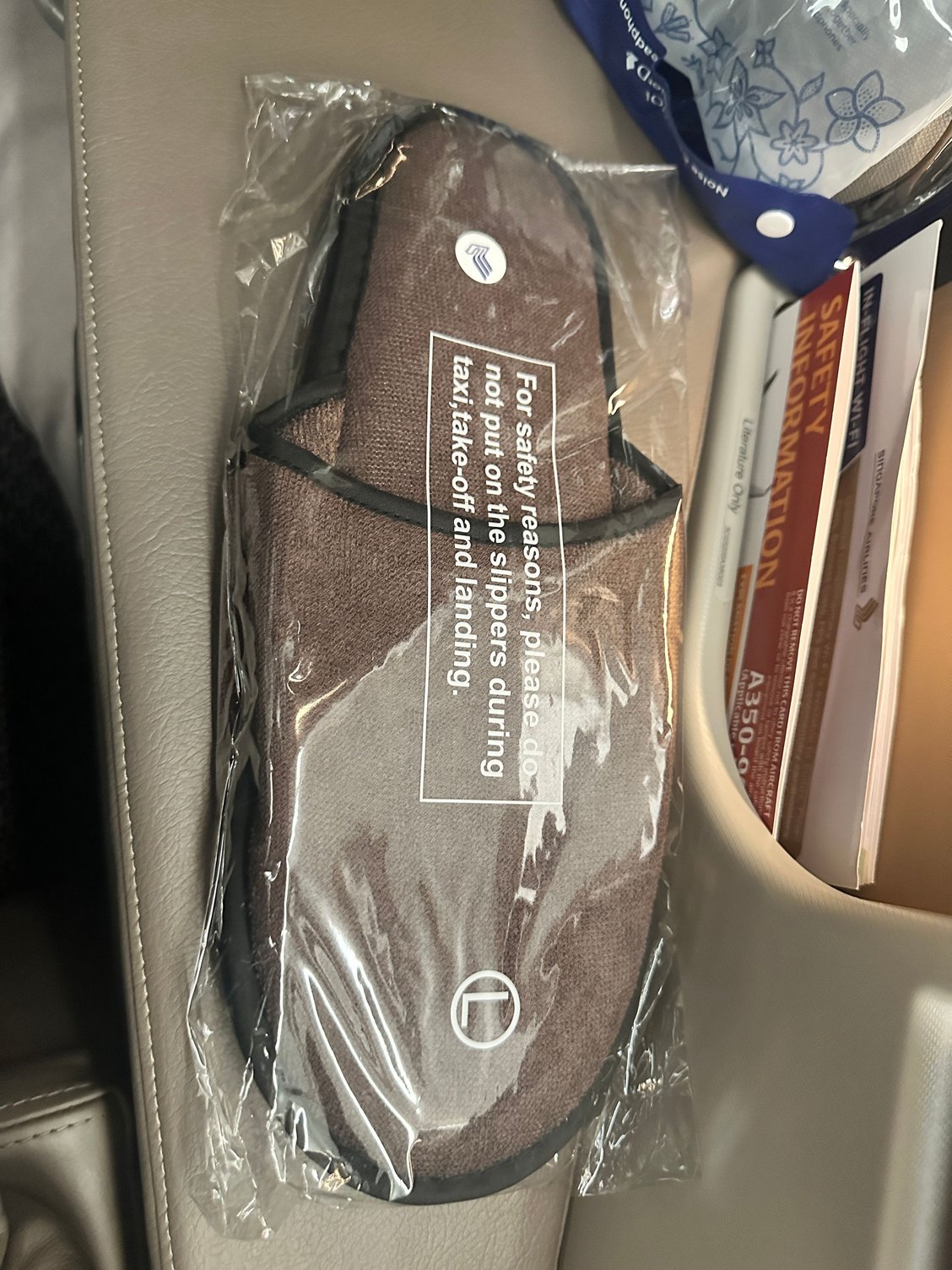 The bits and pieces in the cabin: Water, eyeshade, socks, slippers, headphones