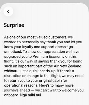 Very pleased to get this upgrade 20min out from boarding. I had already used my RUs on previous flights and did not put in a OneUp. The flight was not full - space in PE and Y (didn't check J). Never had this on AirNZ before!