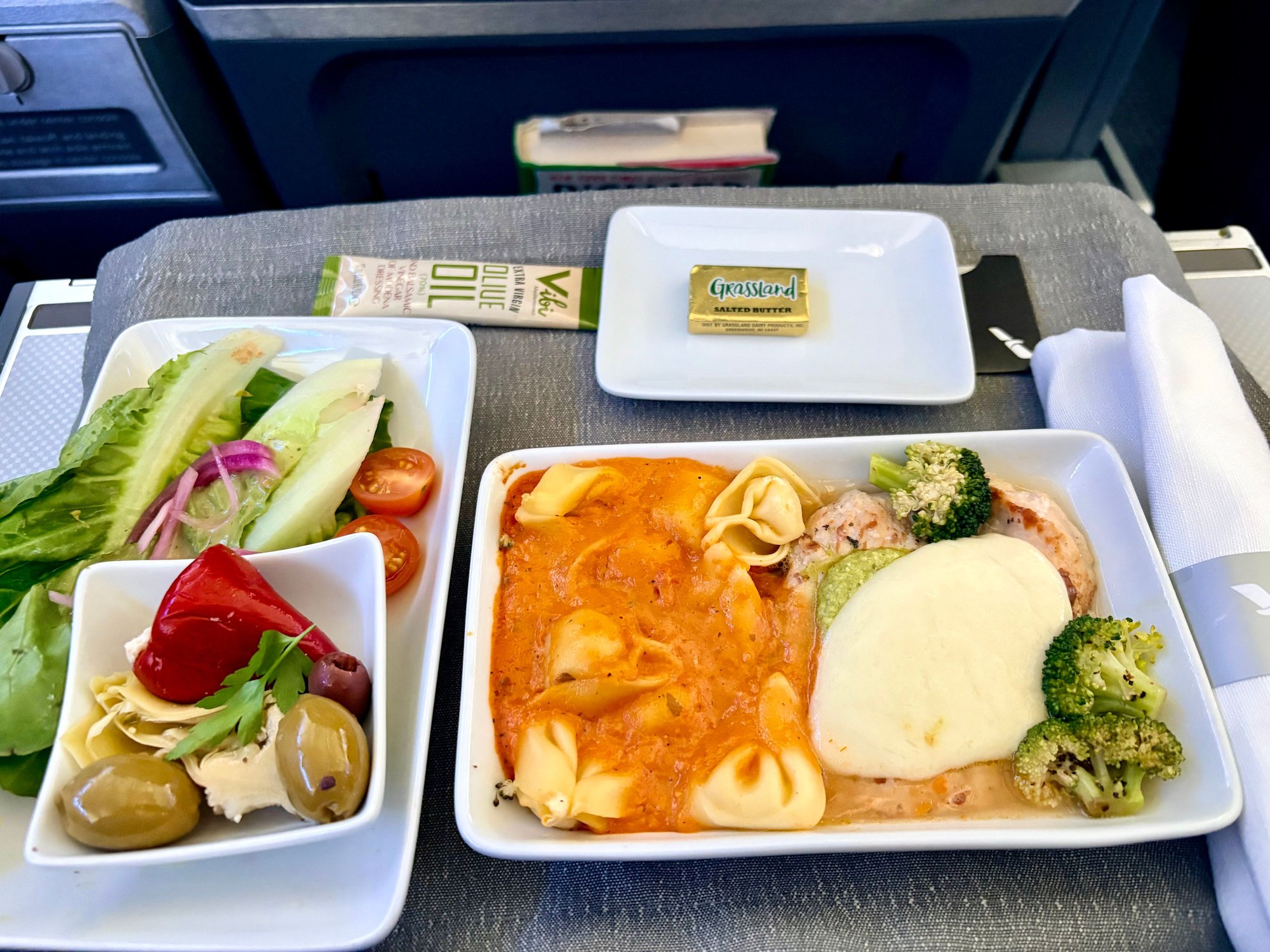Return 2/21 LAS-ORD Chicken and Pesto with Tortellini. Liked this one too, maybe even more than the salmon plate, although a tiny bit watery.