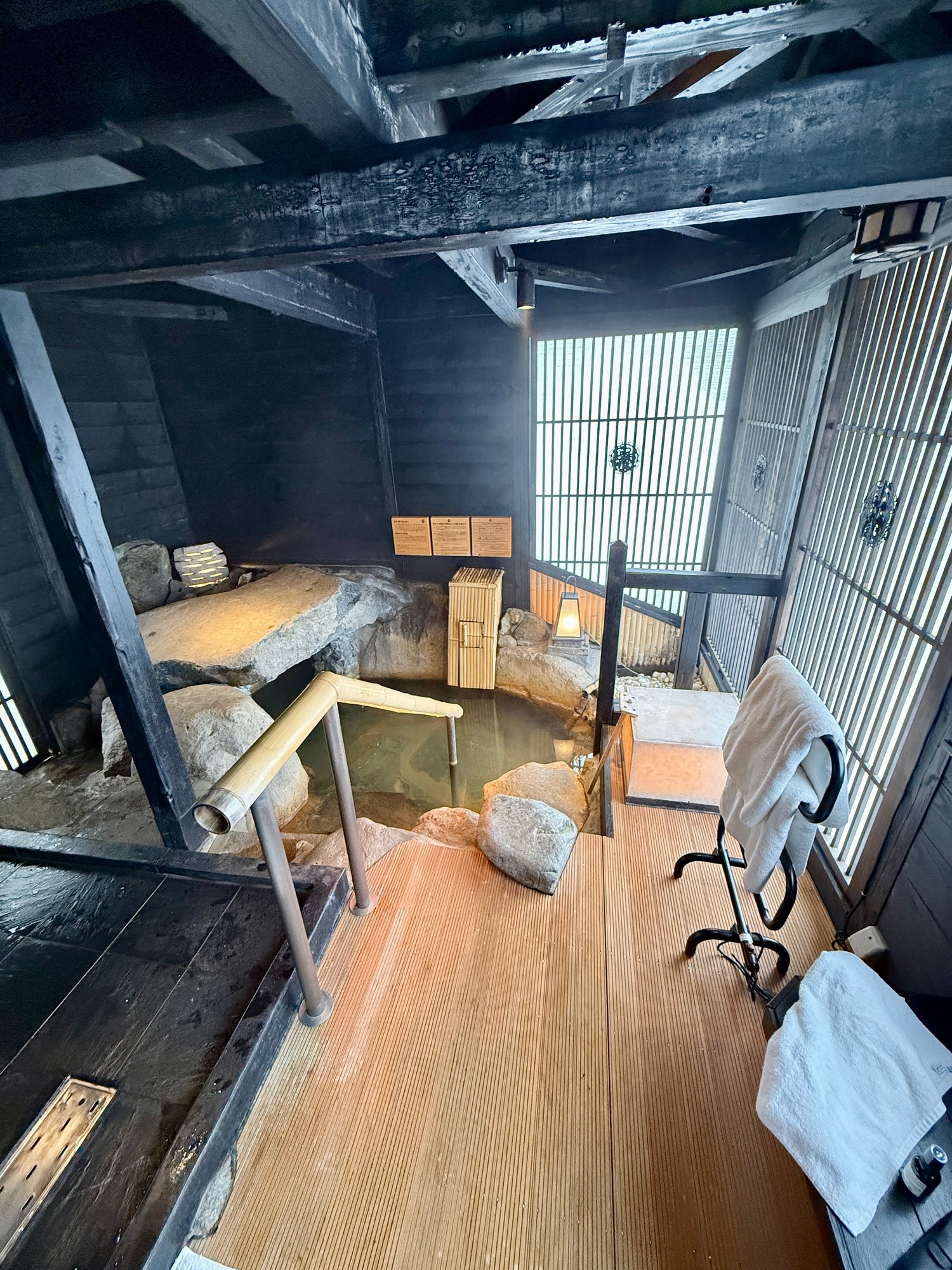 The big issue with this special bath is that the changing area is entirely open air, unlike the other two special baths. This was not ideal on this day as the temps had already dropped to 0 degrees by 5pm and would just get colder (and snowier) until the end of our stay. As such, disrobing and getting into the bath was quite an ordeal. My wife noped out of it instantly and just huddled with warm towels wrapped around her while I did a quick dip.