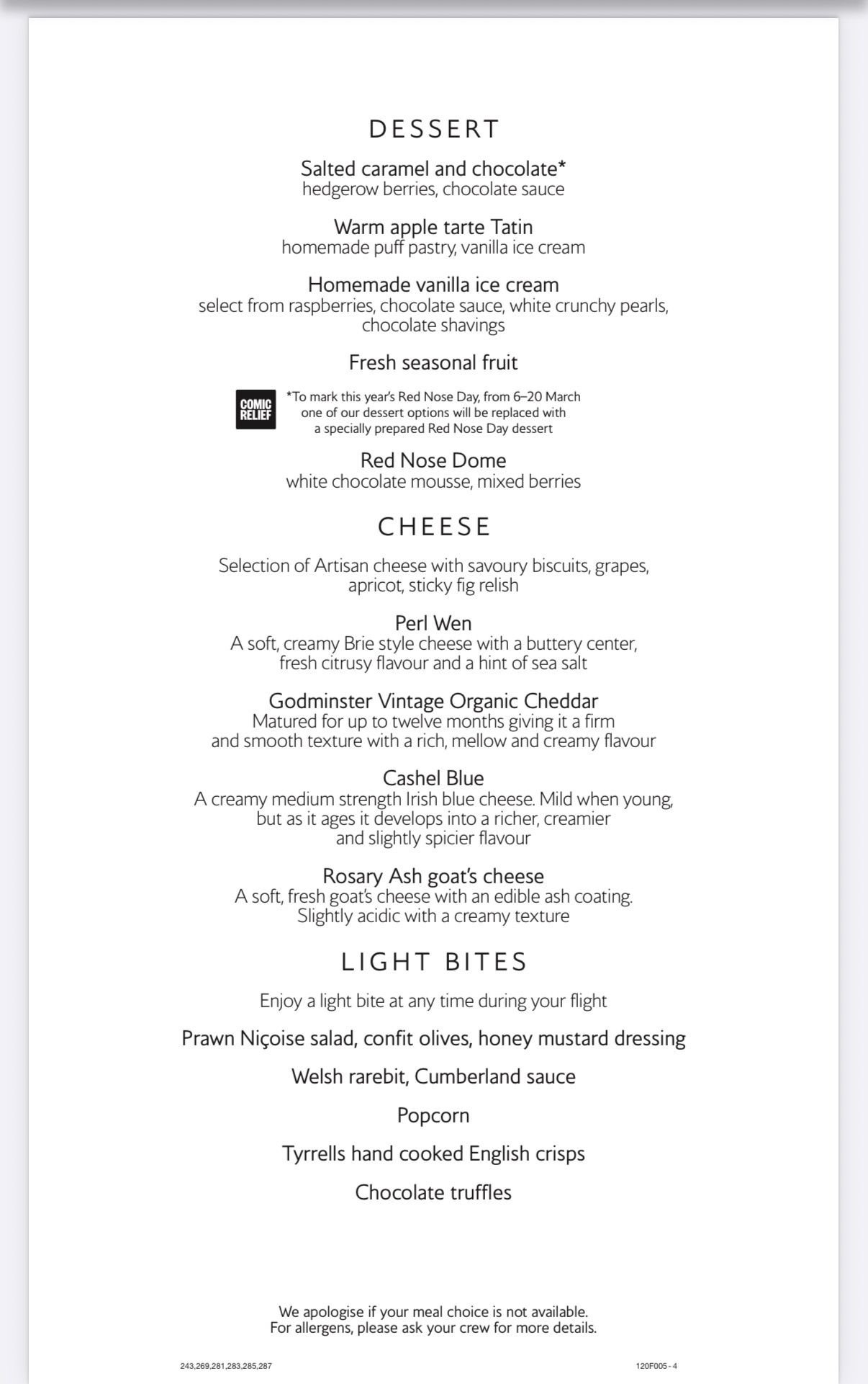 I've just got the March menu for my upcoming flight from London to San Francisco, but the menu looks identical to February's one. It doesn't seem to be a mistake as it mentions the red nose dessert for March, but I'm surprised to see that no changes have been made. Does this look correct to you?