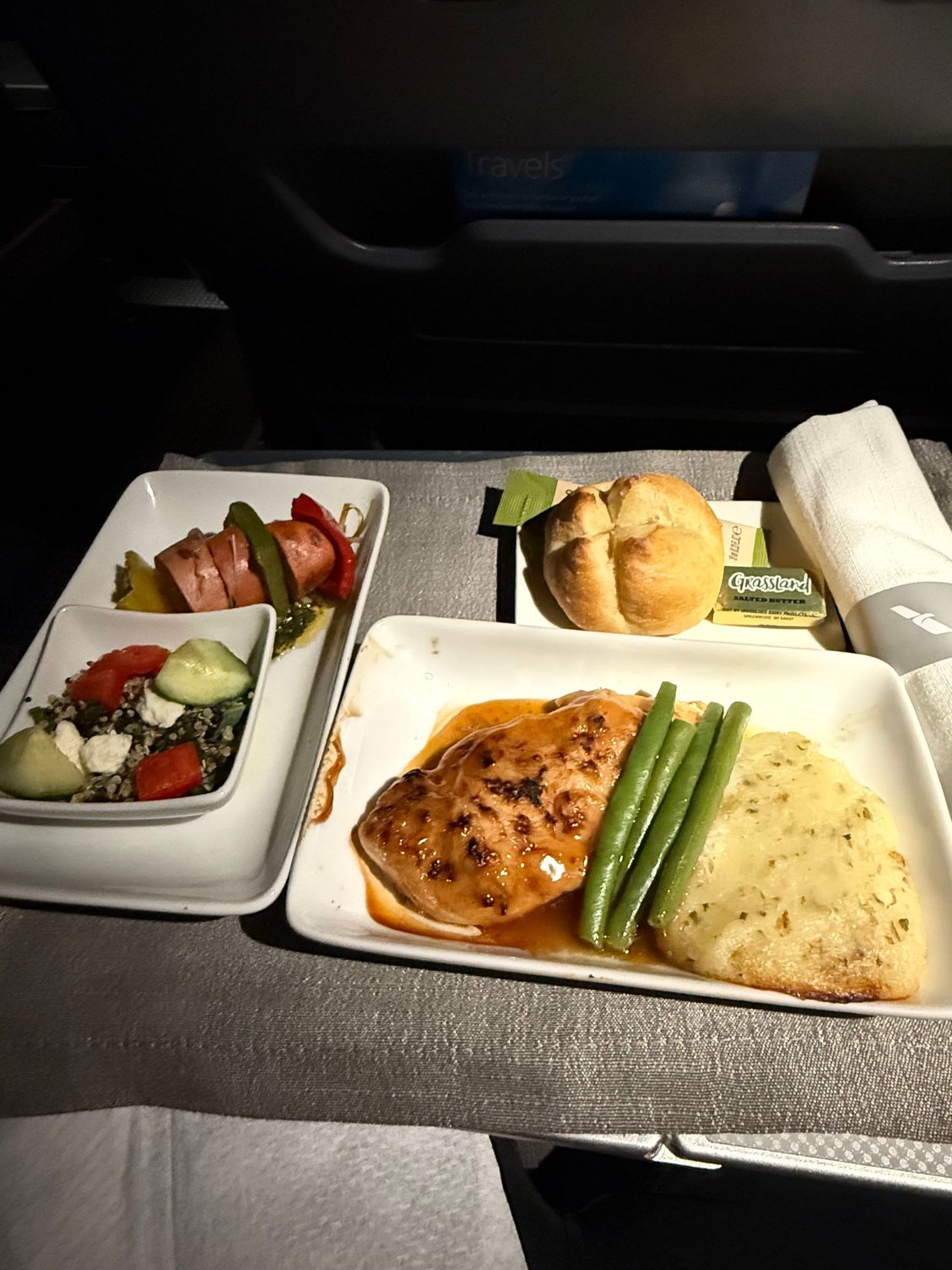 After some rolling delays, I was battlefield upgraded before door closure, so no clue what the choices were. In-air was offered chicken or Mediterranean dish (looking/smelling my neighbors would guess Indian?)