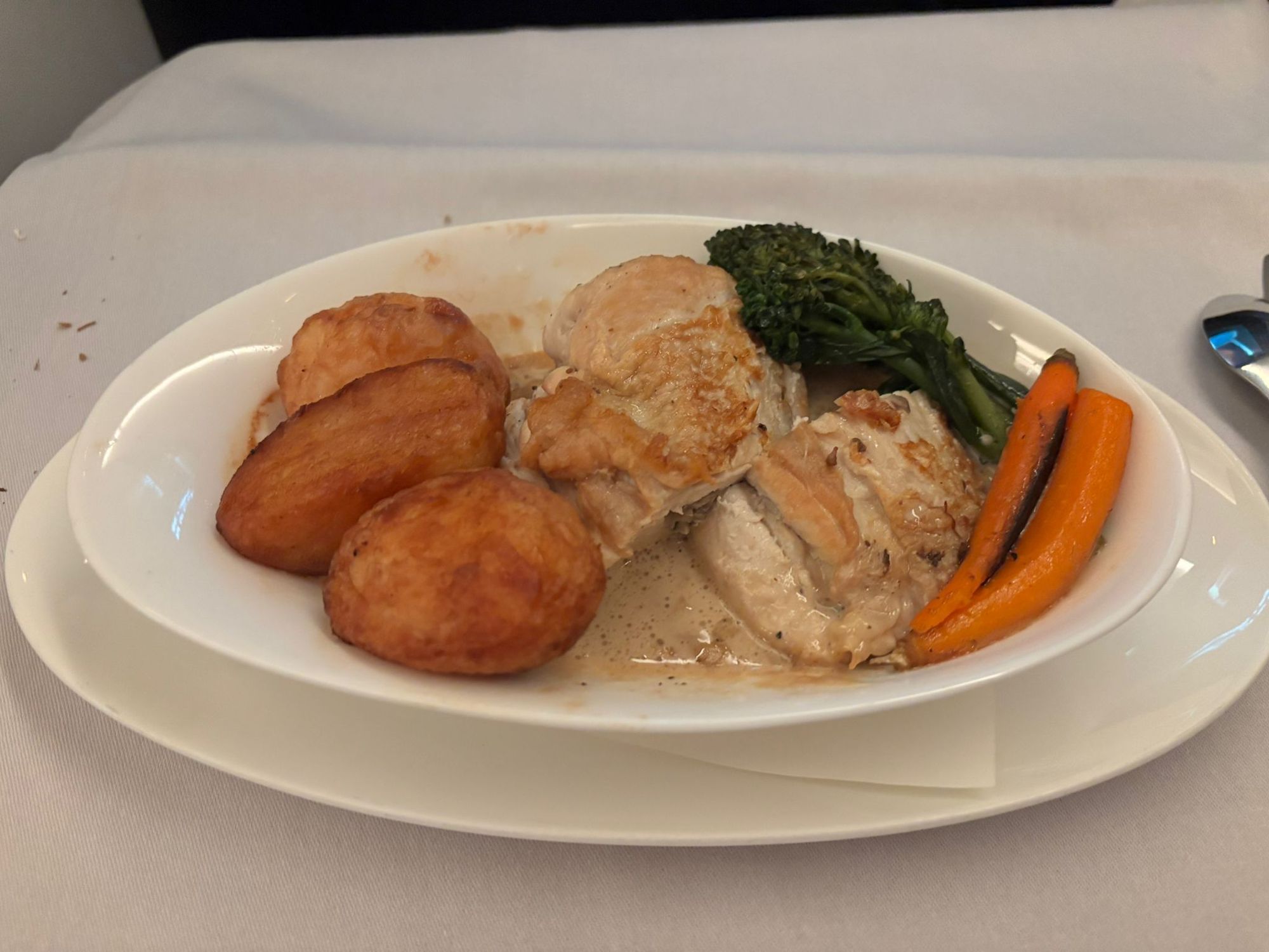 And here's the photos of the food. Friend was frustrated being told they could not have chicken before take off when orders were being taken - all gone. They aren't the DYKWIA type, but they'd paid a substantial amount and were both gold. She asked if status was factored in - and was again told, "my allocation has all gone" however after take off - was told "I've found you a chicken!"