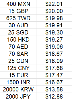 Out of curiosity, I decided to compare the value that the different currencies are getting in USD. Mexico is the big winner at $22, Japan and S Korea are the big losers.