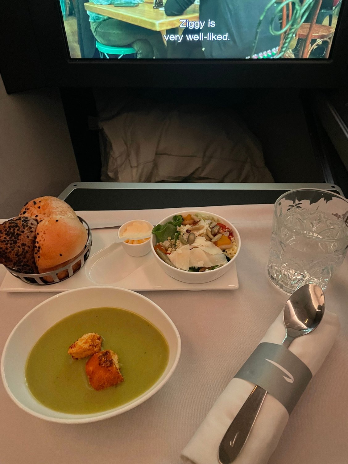 The soup was delicious and the aubergine was OK. I had the fruit for dessert which was the most pitiful / pathetic four pieces of melon (no joke). Skipped the breakfast.
